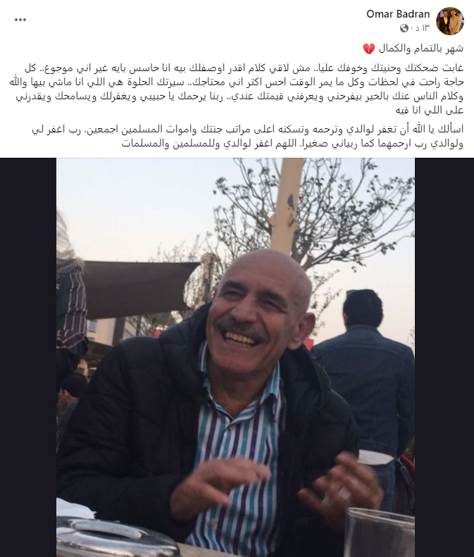 وكتب عمر بدران منشورًا، عبر حسابه الشخصي بموقع التواصل الاجتماعي فيس بوك، قائلًا: شهر بالتمام والكمال.. غابت ضحكتك وحنيتك وخوفك عليا، مش لاقي كلام أقدر أوصف لك بيه أنا حاسس بإيه، غير أني موجوع.