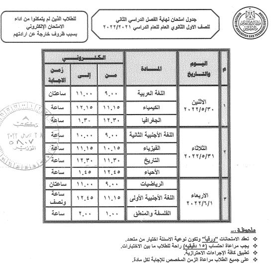 ويؤدي طلاب الصف الأول الثانوي غدًا، امتحانات اللغة العربية والكيمياء والجغرافيا، بدءًا من الـ9 صباحًا حتى الـ1.5 ظهرًا، كما يؤدي طلاب الصف الثاني الثانوي، امتحانات اللغة العربية وتطبيقات الرياضيات والجغرافيا، بدءًا من الـ9 صباحًا حتى الـ12.5 ظهرًا.