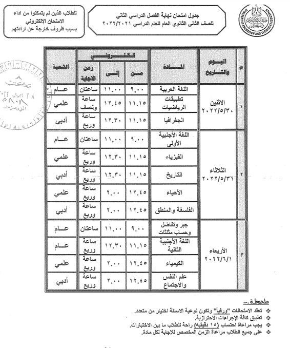وفي وقت سابق، شددت الوزارة، على أنه إذا حدث أي عطل بالكهرباء أو جهاز "التابلت" أو الخادم المدرسي بالنسبة للطلاب الذين لهم الحق في أداء الامتحانات إلكترونيًا، أثناء تواجدهم بلجنة سير الامتحان، يتم تحرير محضر إثبات حالة موقع من مدير المدرسة ومسؤول التطوير التكنولوجي باللجنة.