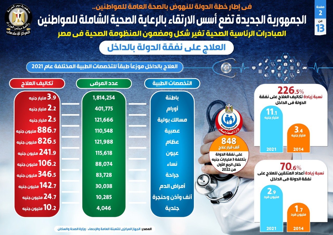 ولفت التقرير إلى زيادة أعداد متلقي العلاج على نفقة الدولة في الداخل بنسبة 70.6%، حيث تم علاج 2.9مليون فرد عام 2021، مقابل1.7 مليون فرد عام 2014، بينما بلغت تكاليف العلاج على نفقة الدولة في الداخل 11.1 مليار جنيه عام 2021، مقابل 3.4 مليار جنيه عام 2014، بنسبة زيادة 226.5%.