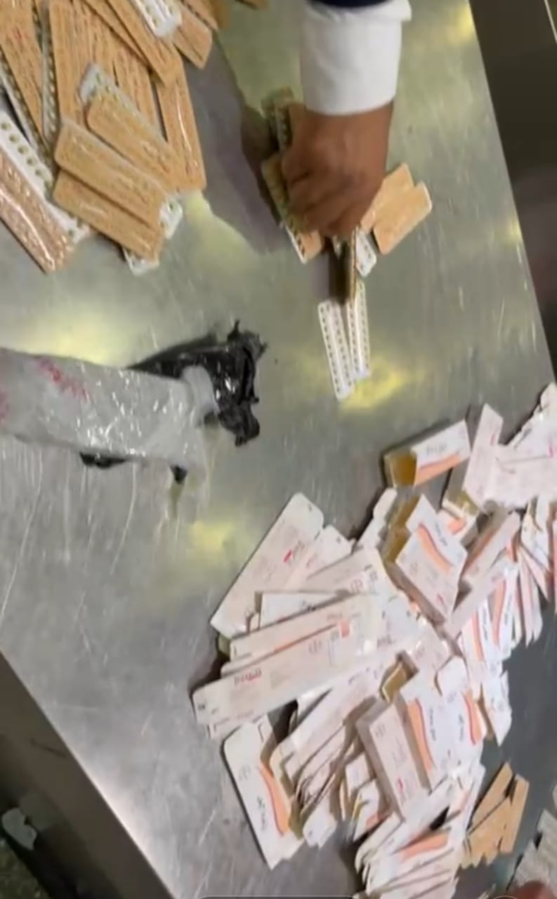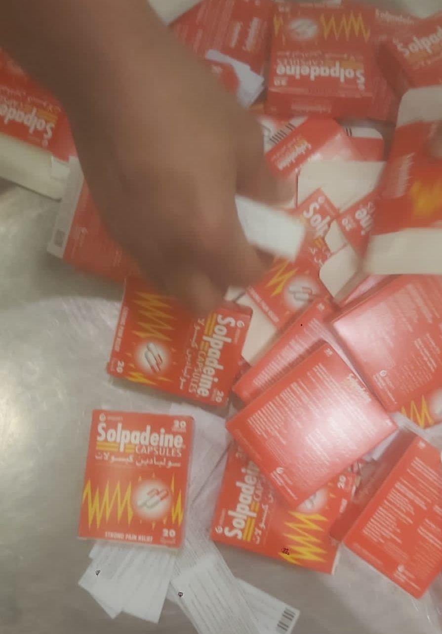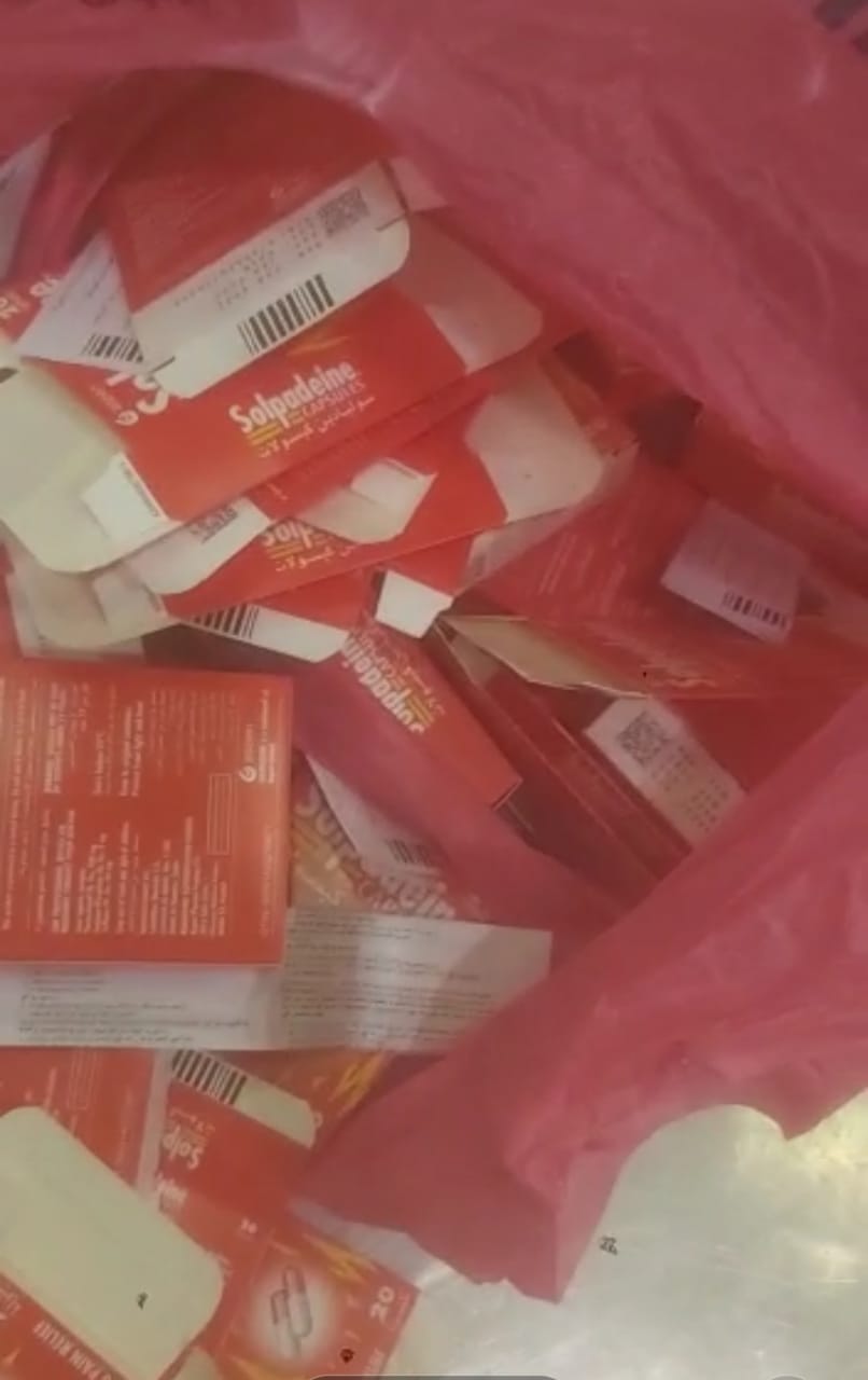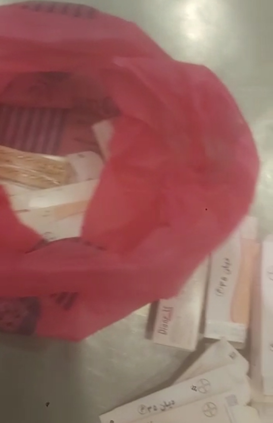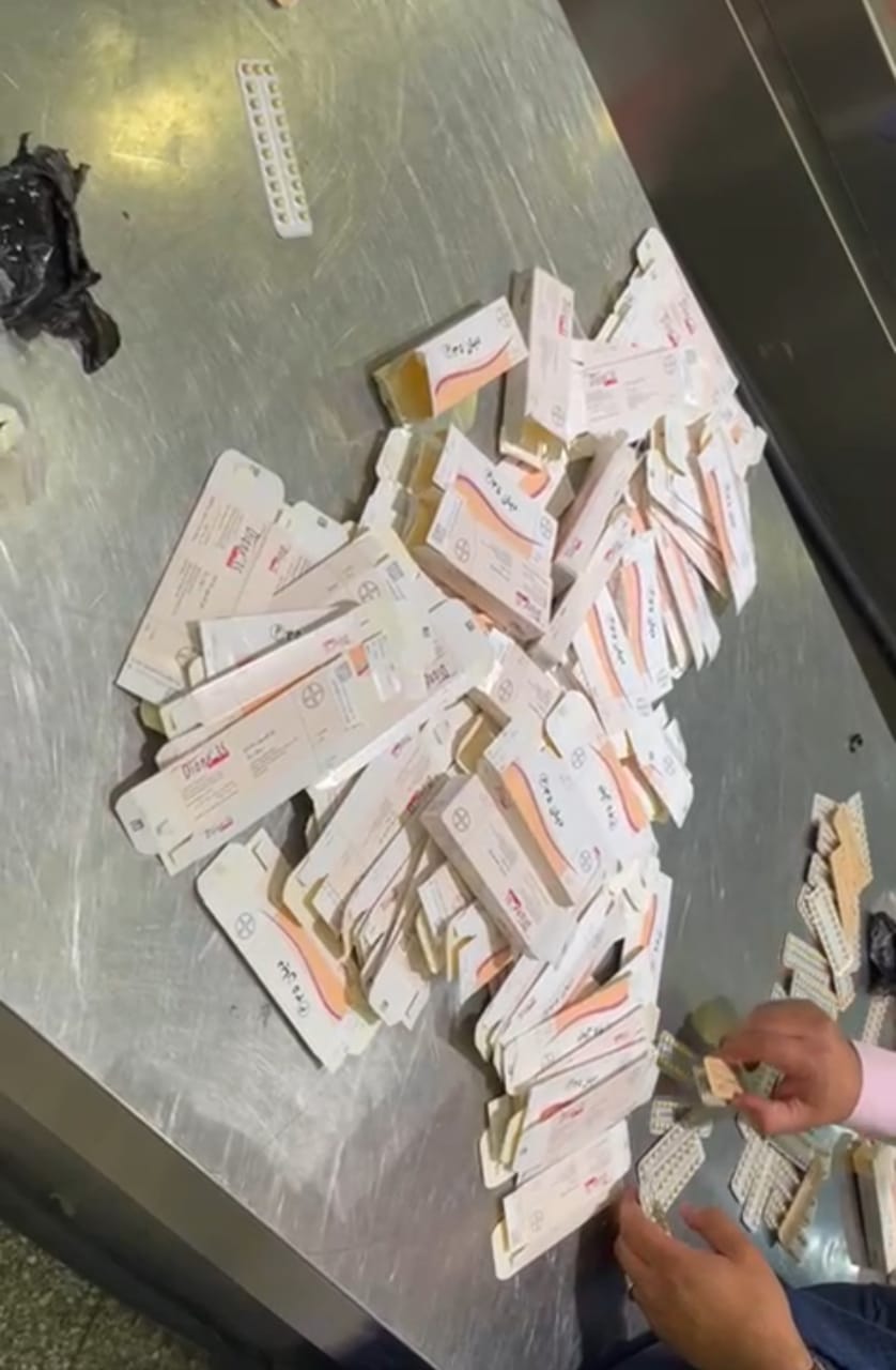 و بتفتيش حقائب الراكب يدويا مما اسفر عن وجود 124 شريطا من دواء Diane الخاص بمنع الحمل و48 شريطا من دواء solpadeine المسكن.