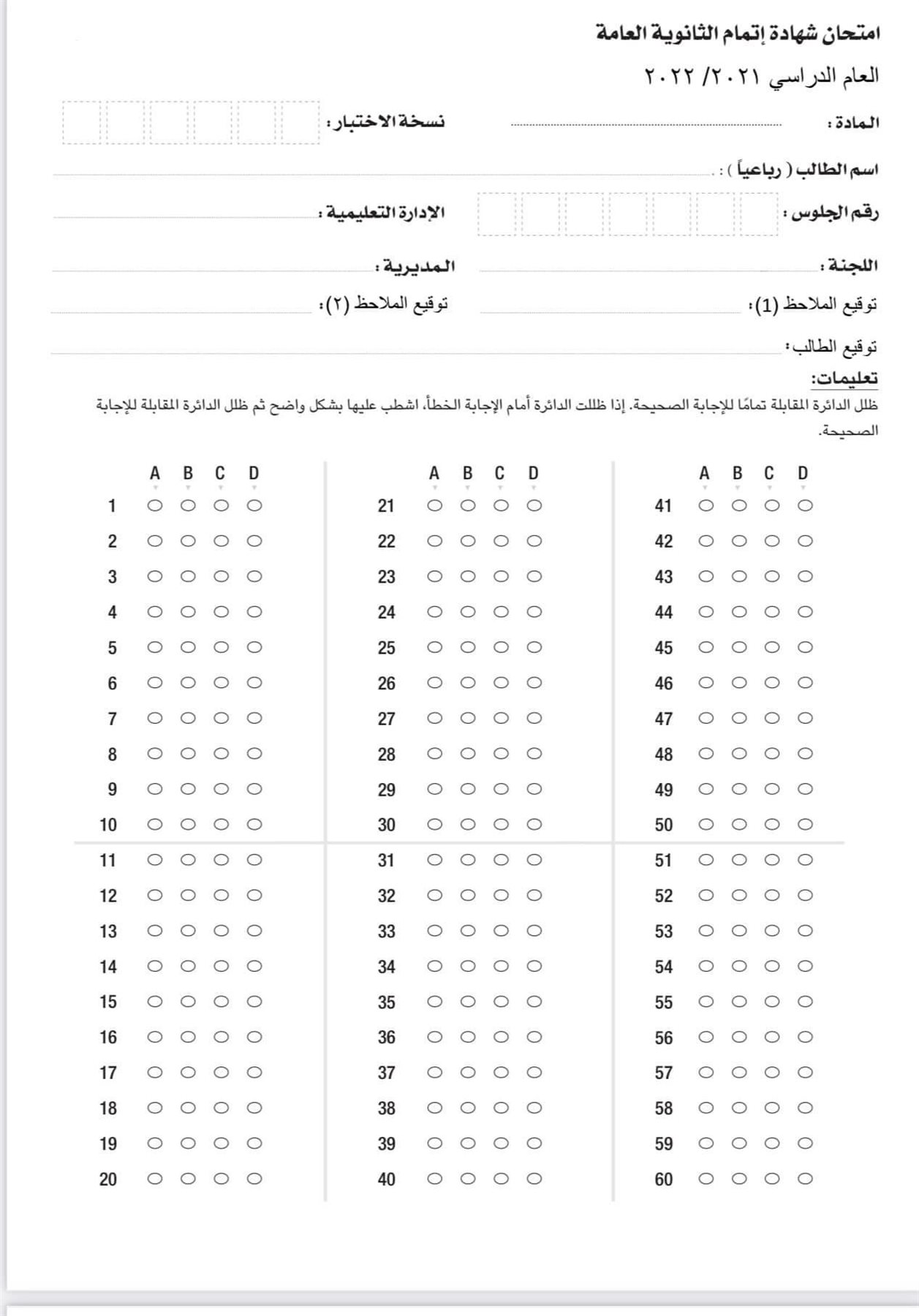 وتضمنت التعليمات: إذا قمت بتظليل دائرة بالقلم الجاف ثم أردت تغيير إجابتك، قم بوضع علامة X على الدائرة الخطأ ثم ظلل الدائرة الأخرى، والالتزام بهذه التعليمات مسؤولية الطالب والإخلال بها لا يعد سببًا للتظلم ولن يعتد به.