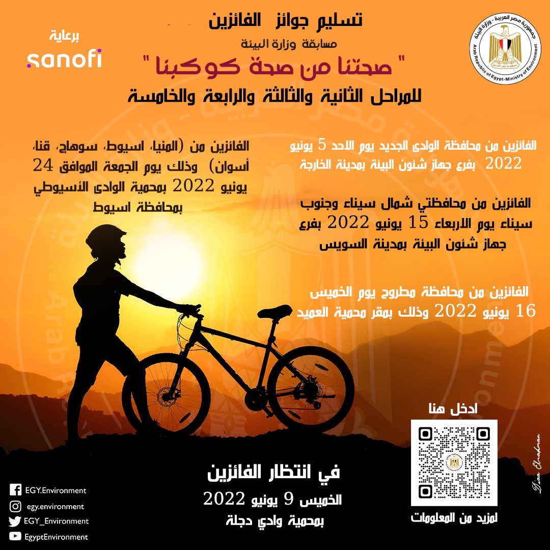 وأوضحت البيئة، أنه في حالة التغيب عن موعد استلام الدراجة؛ يعتبر هذا تنازلا عن الدراجة ولا يمكن المطالبة بها، والمسابقة تأتي في إطار استعداد مصر لاستضافة مؤتمر الأطراف الـ 27 للتغيرات المناخية، والحث على استخدام وسائل النقل المستدام، وتخفيف انبعاثات الكربون، حيث تتمثل جوائز المسابقة في دراجات هوائية يتم توزيعها على الفائزين، وستستمر حتى شهر نوفمبر 2022، وذلك بهدف رفع الوعي البيئي لكافة فئات المجتمع.