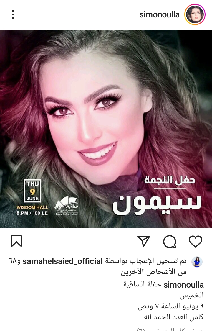 وشاركت سيمون، متابعيها البوستر الرسمي للحفل، عبر حسابها الشخصي بموقع انستجرام، معلقة قائلة: حفلة الساقية، الخميس 9 يونيو الساعة 7 ونص كامل العدد الحمد الله.