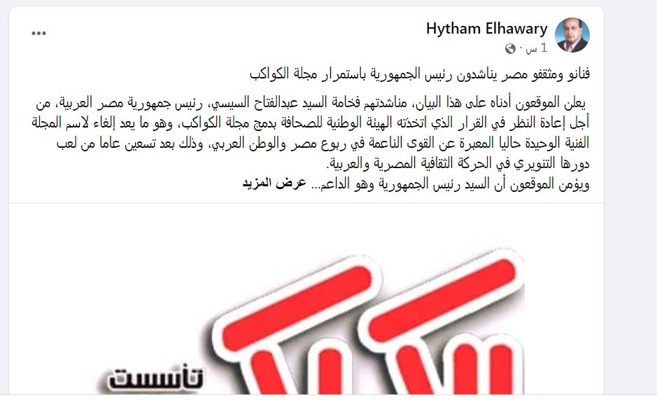 ناشد عدد من فناني ومثقفي مصر، الرئيس عبد الفتاح السيسي باستمرار مجلة الكواكب التي يبلغ عمرها 90 عاما، خلال بيان متداول عبر موقع التواصل الاجتماعي فيسبوك، وقع عليه عدد من الفنانين والمثقفين، منهم الفنان يحيى الفخراني، والفنانة إلهام شاهين والفنانة لقاء الخميسي وغيرهم.