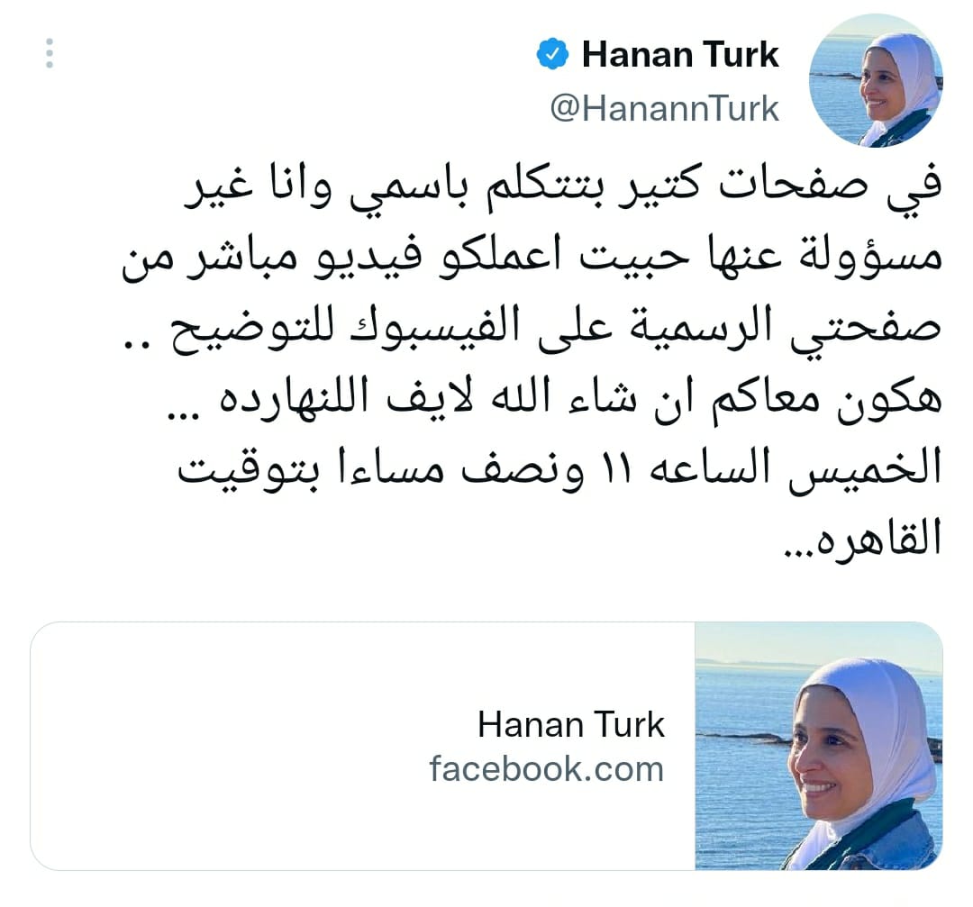 وأعلنت حنان ترك عن ظهورها في لايف مساء اليوم، عبر تغريدة لها بموقع التدوينات القصيرة تويتر، قائلة: في صفحات كثيرة بتتكلم باسمي، وأنا غير مسؤولة عنها، حبيت أعمل لكم فيديو مباشر من صفحتي الرسمية بـ فيس بوك للتوضيح، هكون معاكم إن شاء الله لايف النهاردة الخميس، الساعة 11.5 مساءً بتوقيت القاهرة.