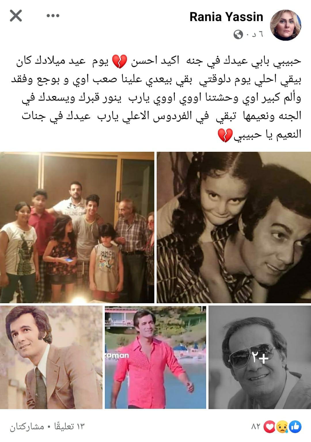 وكتبت رانيا محمود ياسين منشورًا، عبر حسابها الشخصي بموقع التواصل الاجتماعي فيس بوك، قالت فيه: حبيبي بابي عيدك في جنه أكيد أحسن.. يوم عيد ميلادك كان بيبقى أحلى يوم، دلوقتي بقا بيعدي علينا صعب أوي، وبوجع وفقد وألم كبير أوي وحشتنا أوي، يارب ينور قبرك ويسعدك في الجنة ونعيمها تبقا في الفردوس الأعلى يا رب.. عيدك في جنات النعيم يا حبيبي.
