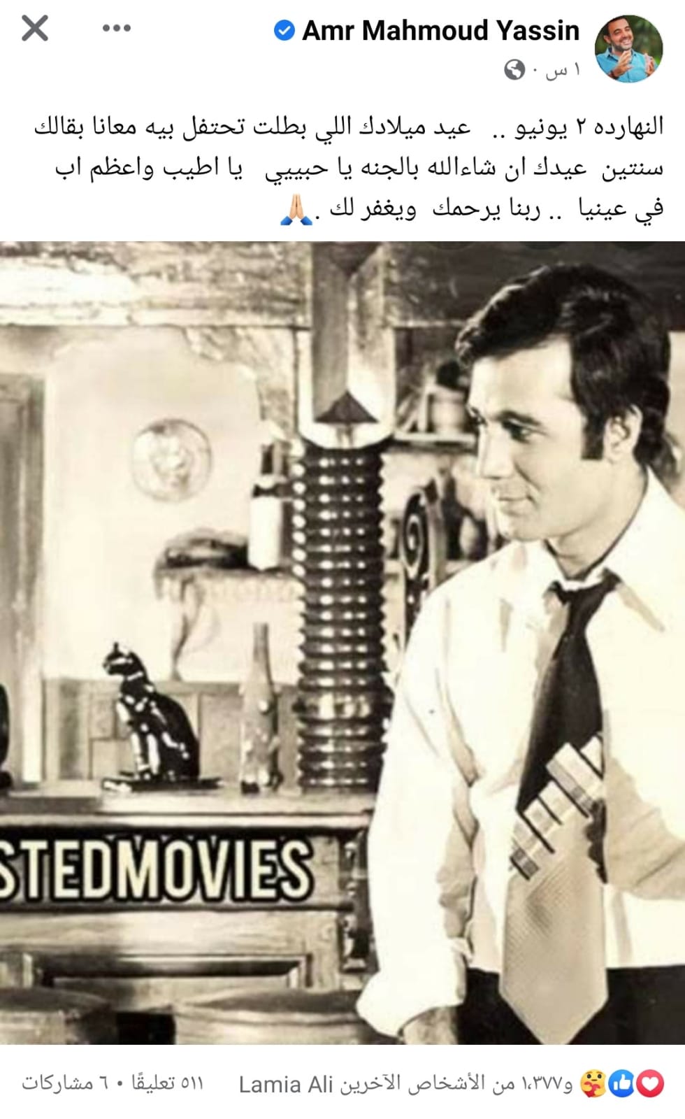 كما كتب عمرو محمدو ياسين أيضًا رسالة مؤلمة لـ والده الراحل، عبر حسابه بـ فيس بوك، قال فيها: النهاردة 2 يونيو.. عيد ميلادك اللي بطلت تحتفل بيه معانا، بقالك سنتين عيدك إن شاء الله بالجنة يا حبييي، يا أطيب وأعظم أب في عينيا.. ربنا يرحمك ويغفر لك.