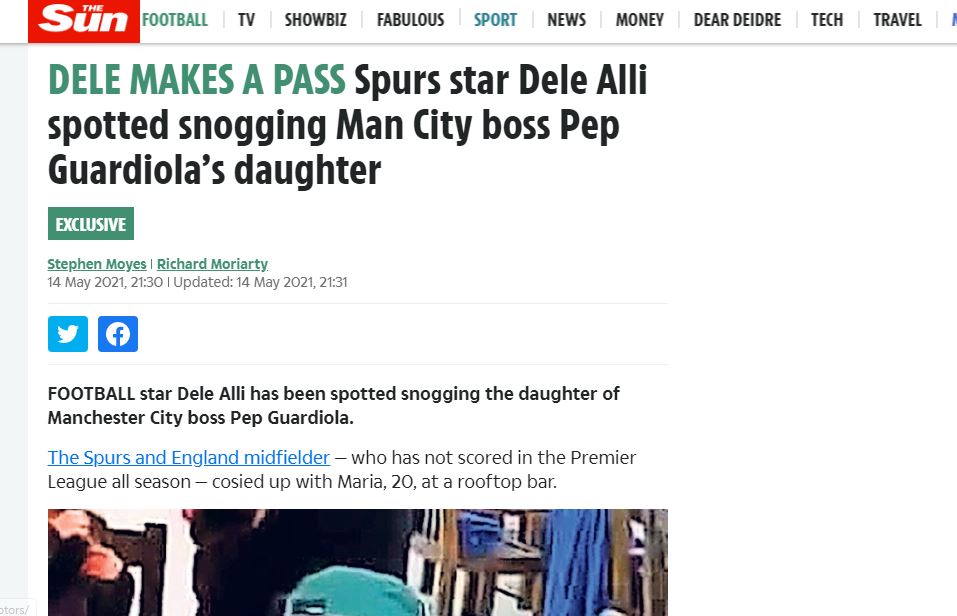 ومن القصص الشهيرة أيضًا خيانة ديلي آلي، نجم توتنهام الحالي، لبيب جوارديولا، مدرب مانشستر سيتي، مع ابنته، فقد انتشرت صورة له رفقتها في أثناء شربهما الكحول، وأثار الأمر غضب مدرب السيتي بشكل كبير، وكان حديث العالم في ذلك الوقت، ولكن لم تقع أي عقوبات على اللاعب بسبب هذا الأمر.