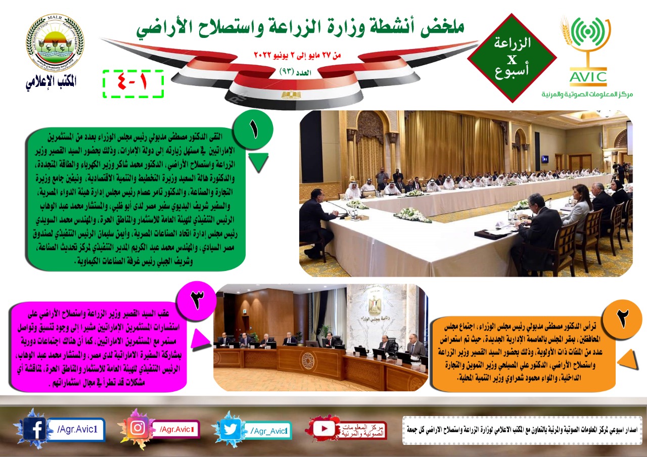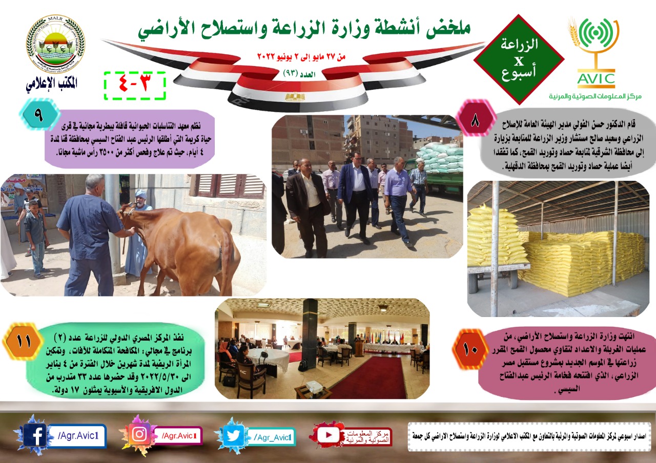 أصدر مركز المعلومات الصوتية والمرئية، التابع لوزارة الزراعة واستصلاح الأراضي، الانفوجراف الأسبوعي، في نسخته رقم 93، حول الحصاد الأسبوعي لأهم أنشطة الوزارة، خلال الأسبوع الماضي في الفترة من 27 مايو حتى 2 يونيو الجاري، وذلك بالتعاون مع المكتب الإعلامي للوزارة.