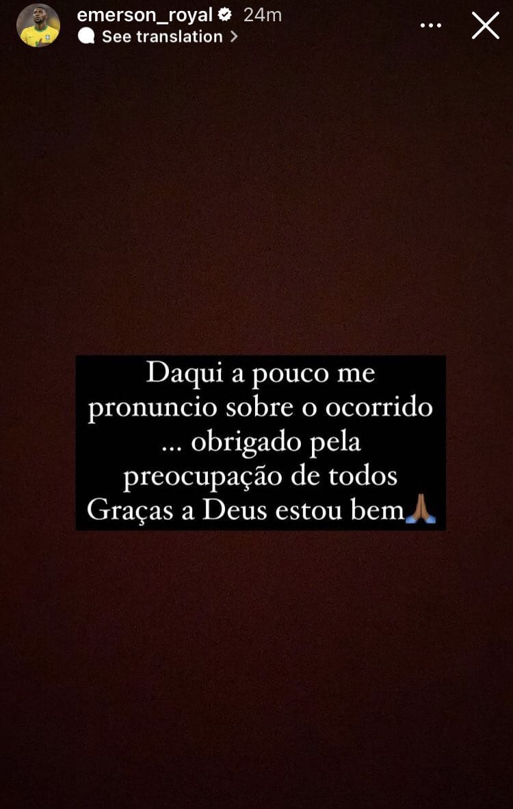 فيما علق إيمرسون على الحادث خلال حسابه الرسمي على موقع التواصل الاجتماعي انستجرام، قائلًا: سأتحدث قريبًا عما حدث.. شكرًا على اهتمام الجميع والحمدلله أنا بخير.