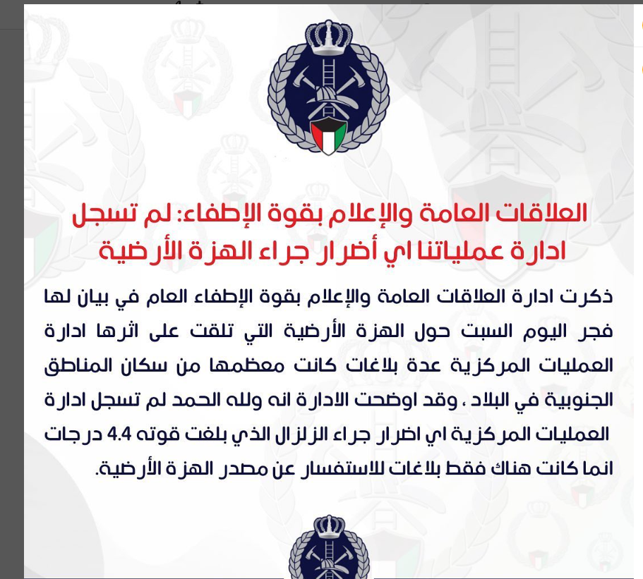 وأعلنت إدارة العلاقات العامة والإعلام بقوة الإطفاء، أن إدارة عملياتها لم تسجل أي أضرار من جراء الهزة الأرضية التي ضربت الكويت فجر السبت.