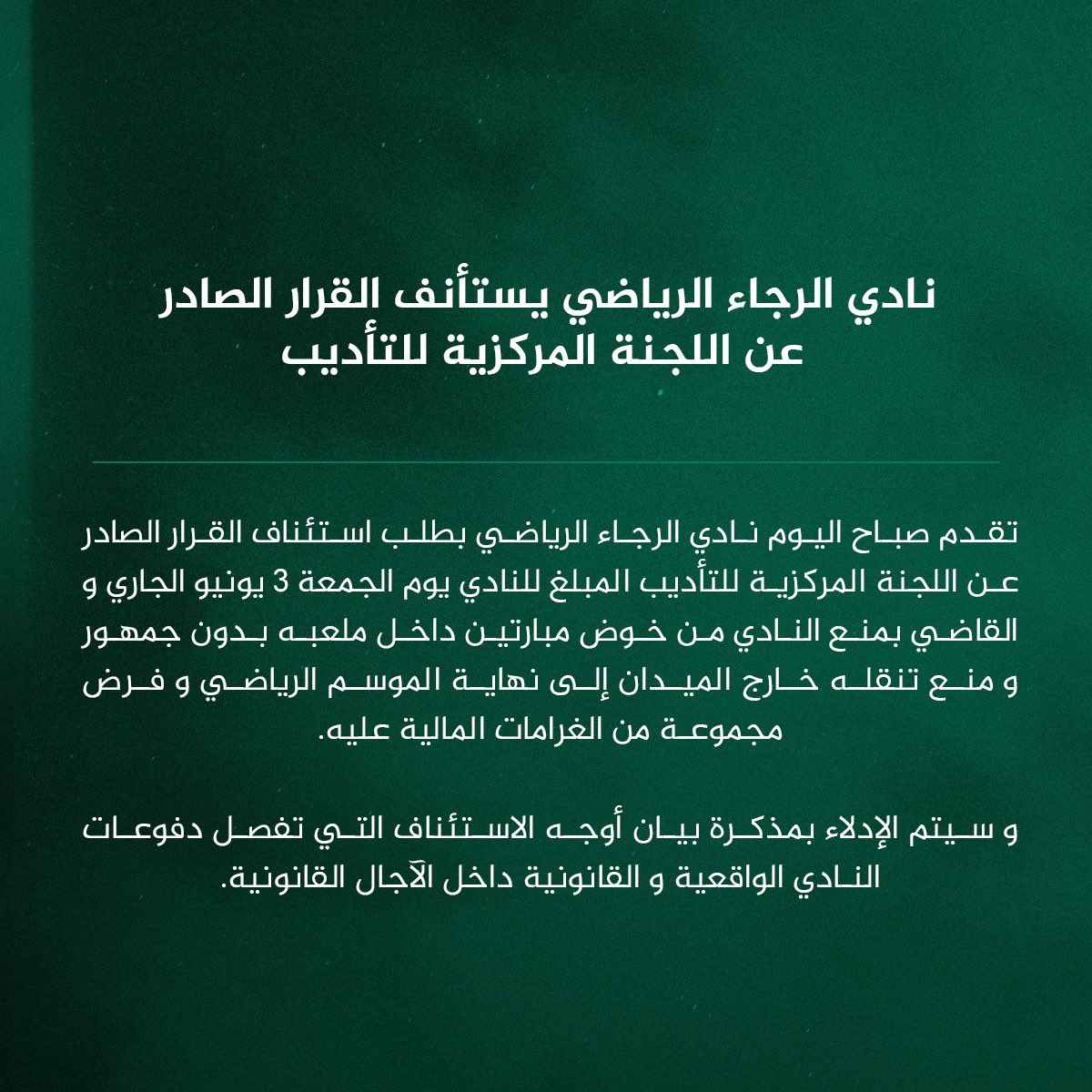 وقال نادي الرجاء الرياضي في بيان نشره على حسابه الرسمي على إحدى مواقع التواصل الاجتماعي تويتر: تقدم صباح اليوم نادي الرجاء الرياضي بطلب استئناف على القرار الصادر عن اللجنة المركزية للتأديب المبلغ للنادي يوم 3 يونيو، والقاضي بمنع النادي بخوض مباراتين داخل ملعبه دون جمهور ومنع تنقله خارج الميدان إلى نهاية الموسم وفرض مجموعة من الغرامات المالية عليه.