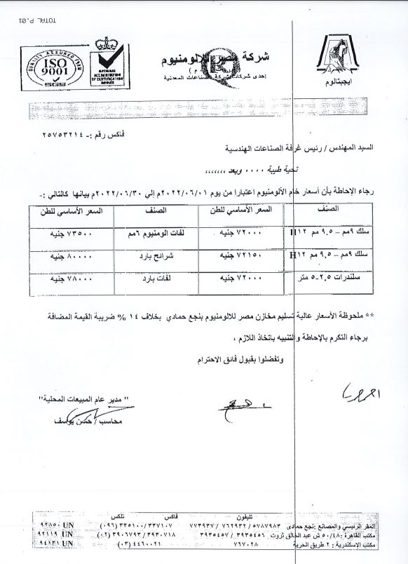 وبحسب مستند، حصل القاهرة 24 على نسخة منه، هبط سعر طن السلندرات خلال يونيو الجاري، في أسعار شركة مصر للألمونيوم، إلى 72 ألف جنيه مقابل 79500 جنيه، كما انخفض سعر طن السلك إلى 72150 جنيهًا مقابل 78150 جنيهًا، مقارنة بالشهر السابق.