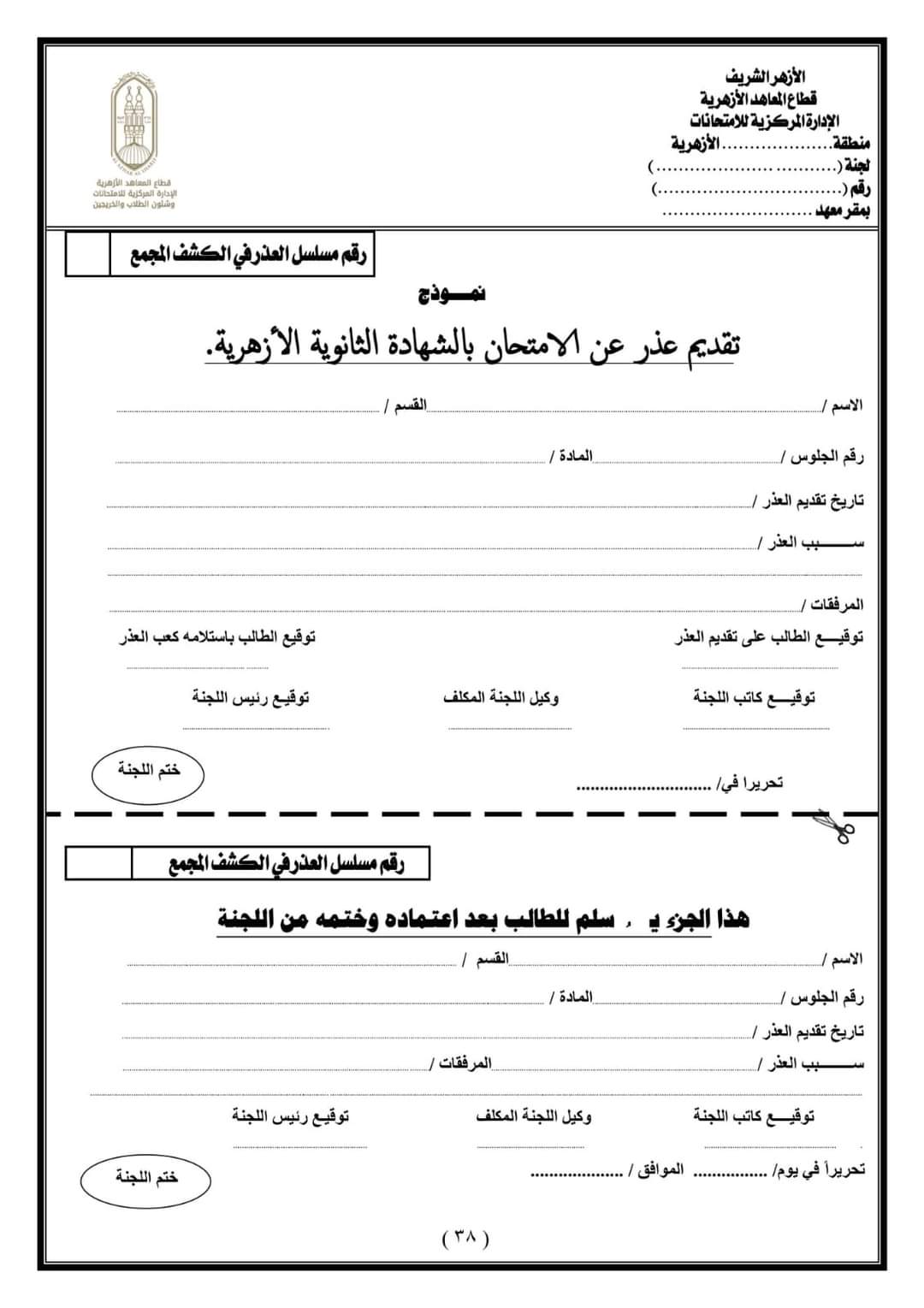 ويمكن لطلاب الشهادة الثانوية الأزهرية، تقديم استمارة عذر عن الامتحان بالشهادة الثانوية الأزهرية؛ بسبب المرض أو ظرف اجتماعي طارئ وتأجيله إلى الامتحان التكميلي أو الدور الثاني.