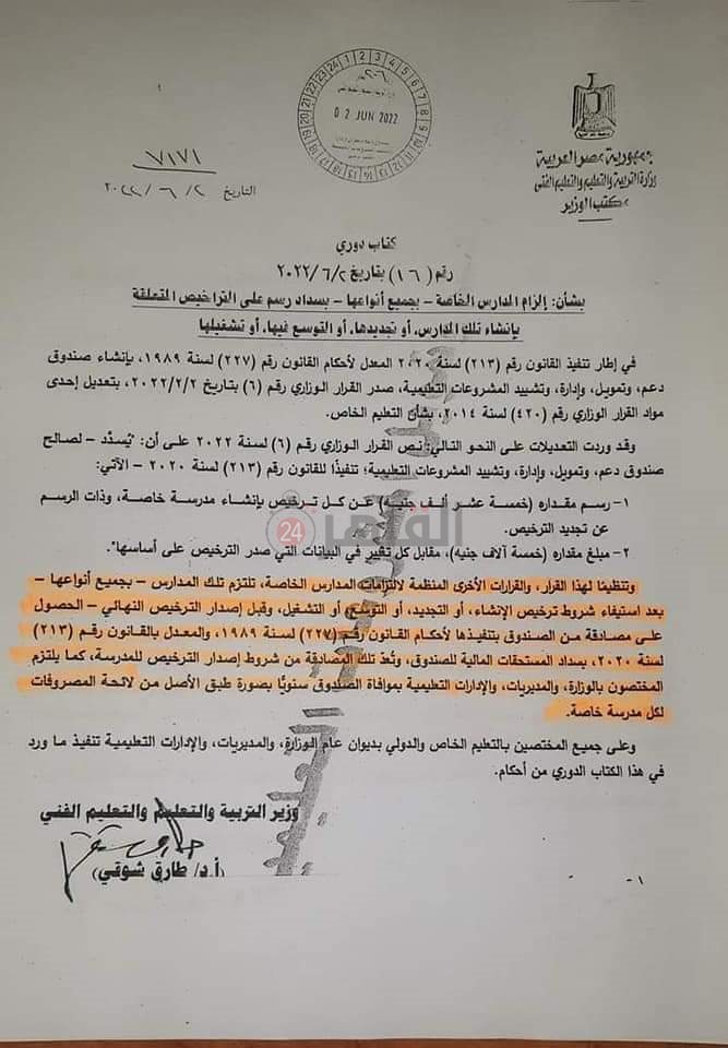 وحصل القاهرة 24، على نص الكتاب الدوري بشأن رسوم ترخيص عن إنشاء كل مدرسة خاصة لصالح صندوق دعم المشروعات.