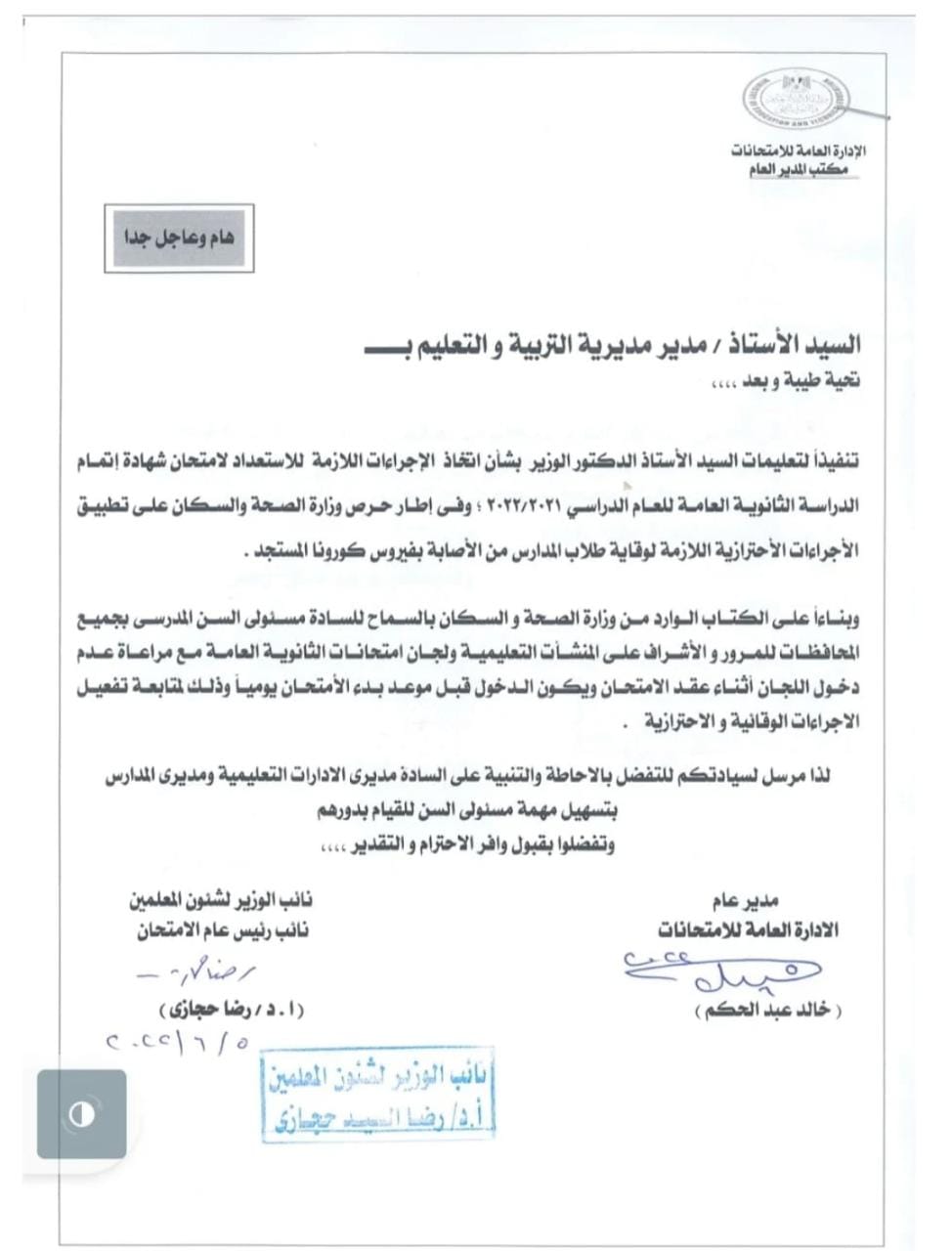 وأشارت الإدارة العامة للامتحانات في خطابها، إلى أنه تنفيذا لتعليمات الدكتور طارق شوقي وزير التربية والتعليم والتعليم الفني، بشأن اتخاذ الإجراءات اللازمة للاستعداد لامتحان شهادة إتمام الدراسة الثانوية العامة للعام الدراسي 2021/2022، وفي إطار حرص وزارة الصحة والسكان على تطبيق الإجراءات الاحترازية اللازمة لوقاية طلاب المدارس من الإصابة بفيروس كورونا المستجد.