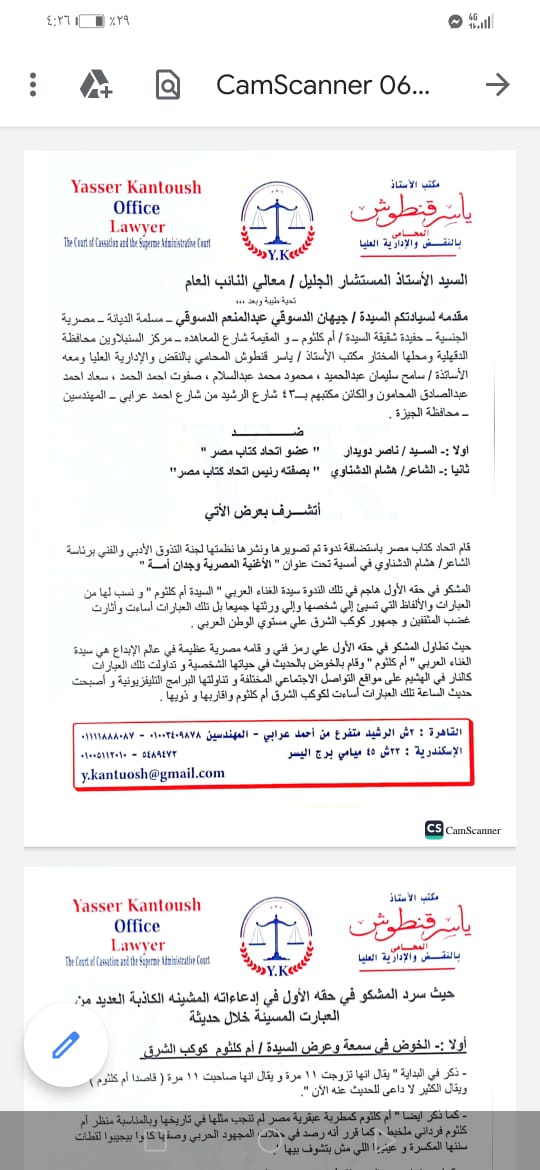 تقدمت جيهان الدسوقي حفيدة شقيقة كوكب الشرق أم كلثوم، ببلاغ اليوم للنائب العام يحمل رقم 25443 لسنة 2022 ضد كل من ناصر دويدار عضو اتحاد كتاب مصر، والشاعر هشام الدشناوي رئيس الاتحاد، بتهمة التشهير والسب والقذف في حق جدتها.