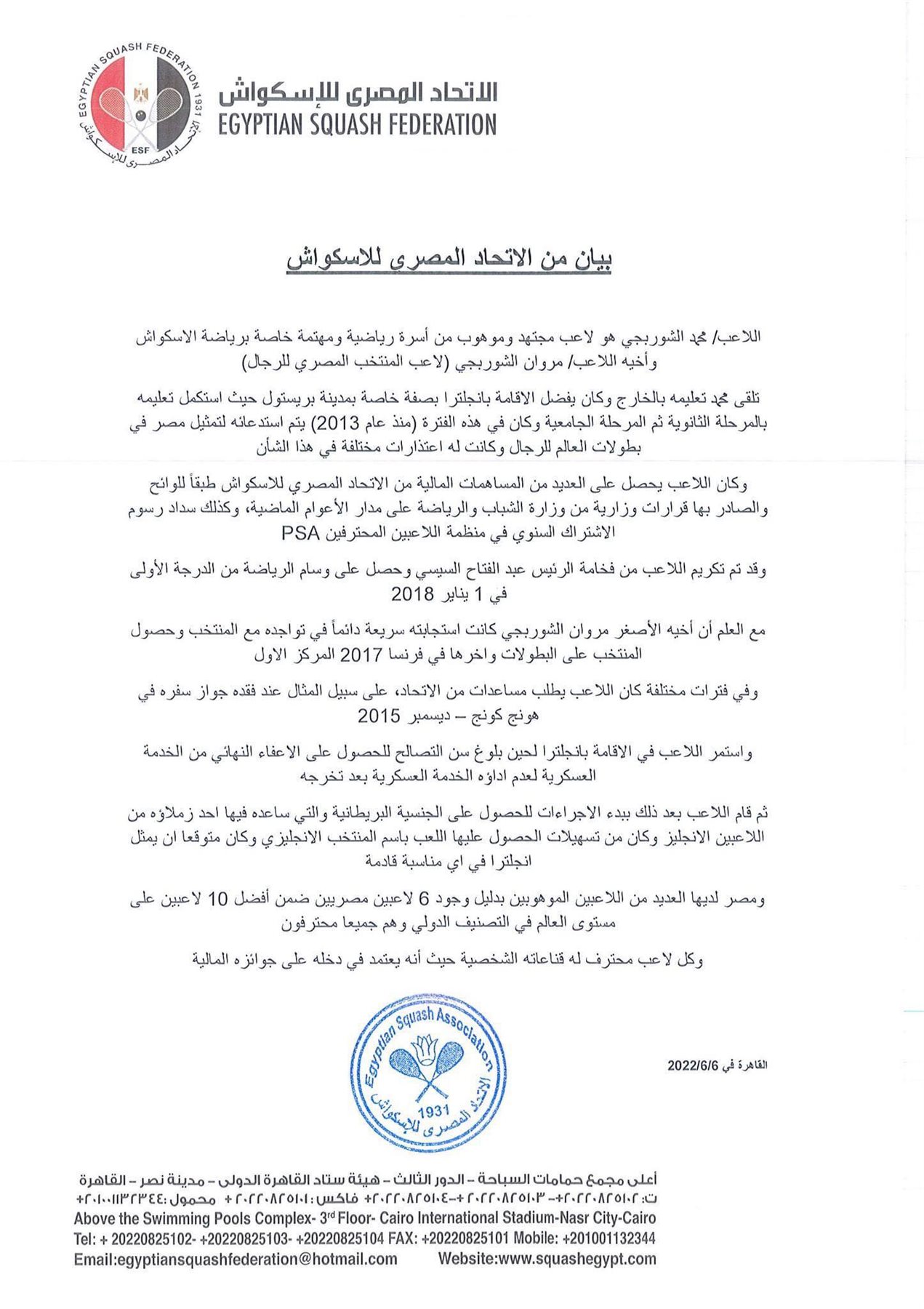 بيان اتحاد الإسكواش بشأن محمد الشوربجي