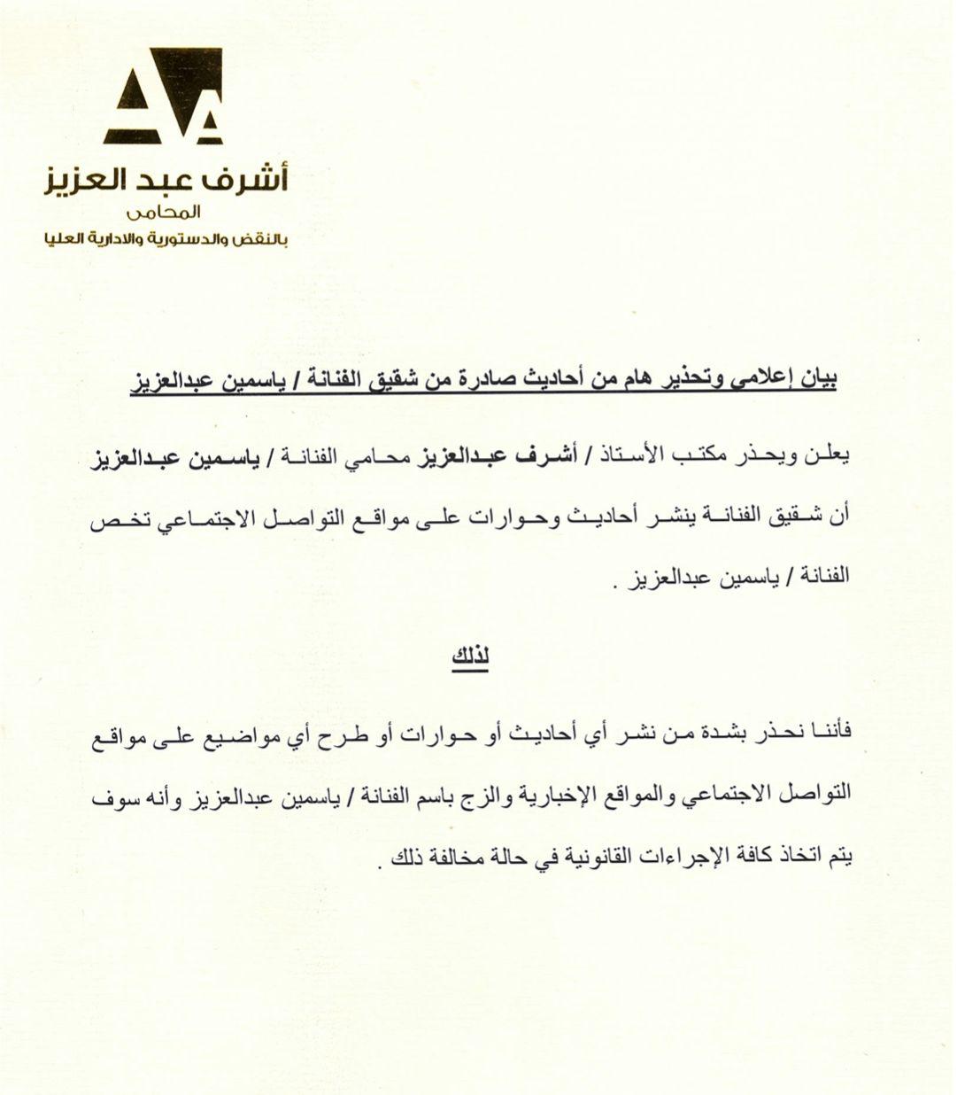 وقال بيان ياسمين عبد العزيز: يحذر مكتب أشرف عبد العزيز محامي الفنانة ياسمين عبد العزيز أن شقيق الفنانة ينشر أحاديث وحوارات على مواقع التواصل الاجتماعي تخص الفنانة ياسمين عبد العزيز.