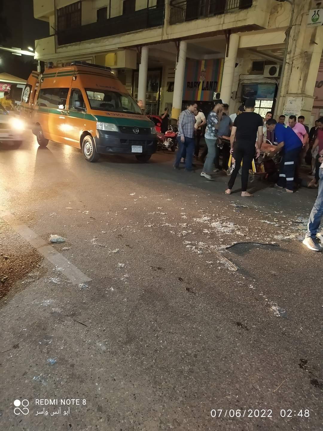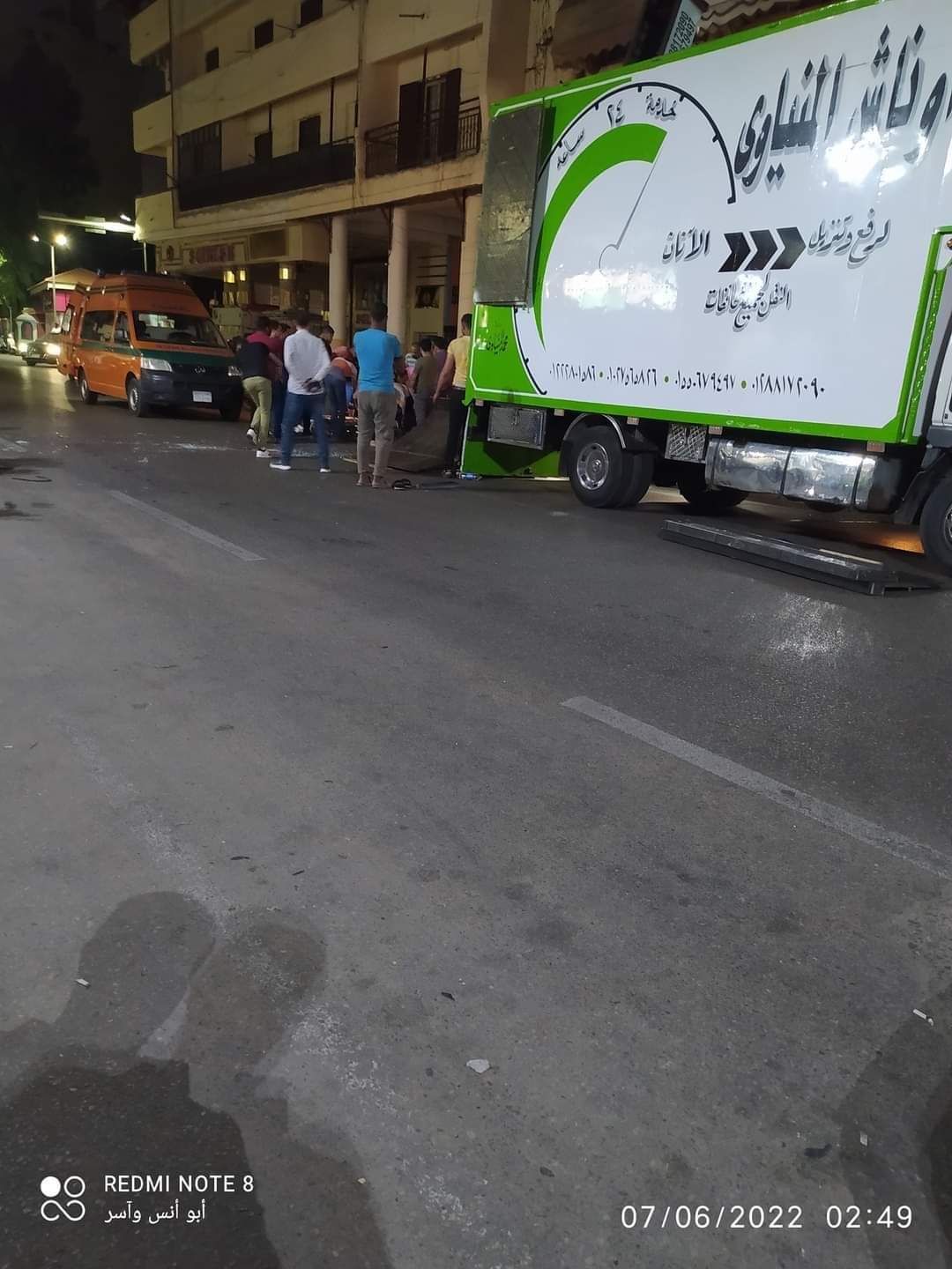 وصلت سيارة الإسعاف إلي مكان الحادث والشخص ملقي علي الأرض غارقًا في دمائه نتيجة تعرضه لحادث سقوط ونش مخصص لرفع العفش إلي الأدوار المرتفعة.