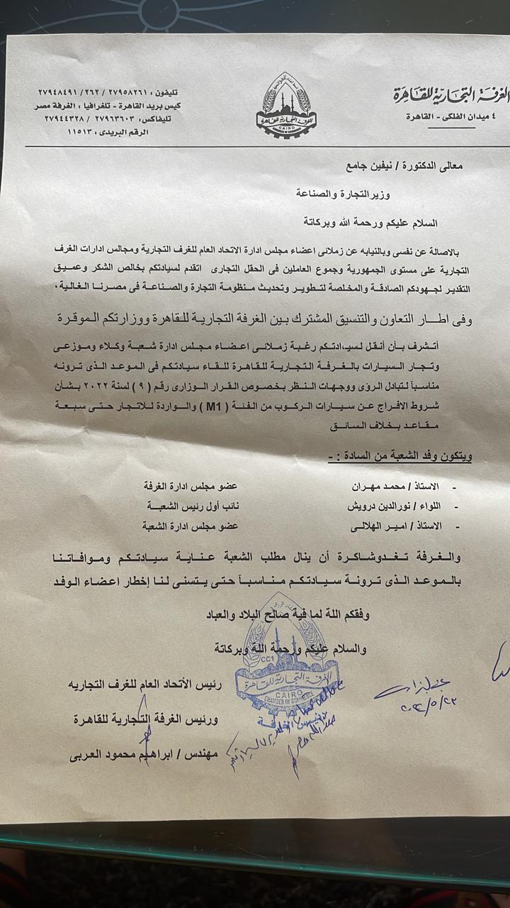 وقال العربي في خطاب للوزيرة، إن الاجتماع سيضم كلًا من محمد مهران عضو مجلس إدارة غرفة القاهرة التجارية، اللواء نور الدين درويش نائب رئيس شعبة السيارات، والمهندس أمير الهلالي عضو مجلس إدارة الشعبة ورئيس لجنة المستوردين.