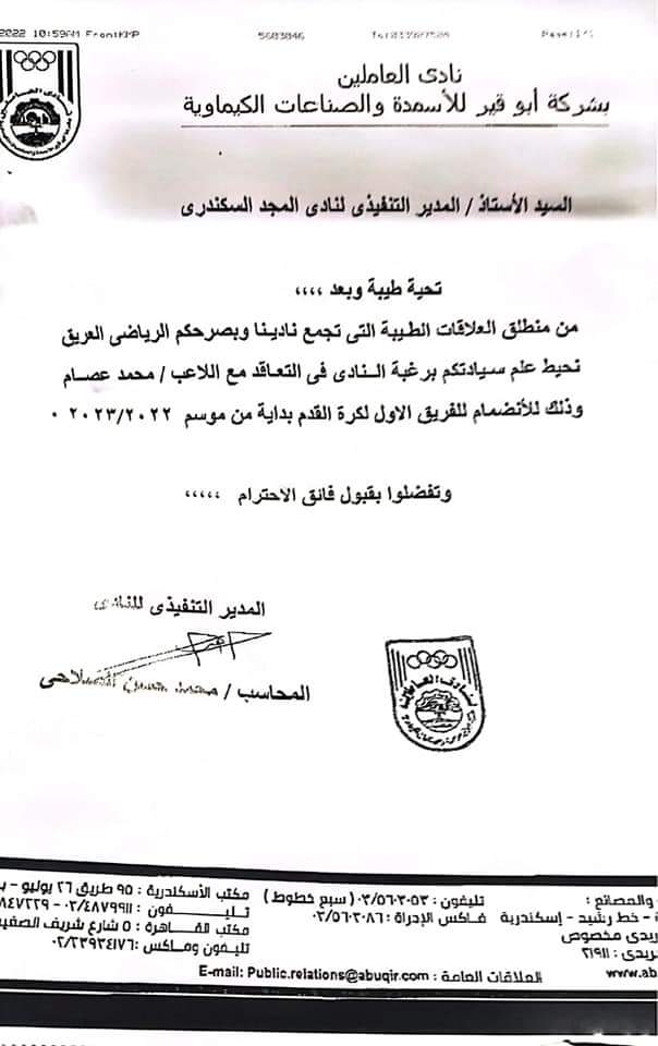 تلقى مسئولونادي المجد السكندري برئاسة إسلام الصياد، فاكسًا رسميًا لانتقال اللاعب محمد عصام إلى صفوف أبو قير للاسمدة بداية من الموسم المقبل.