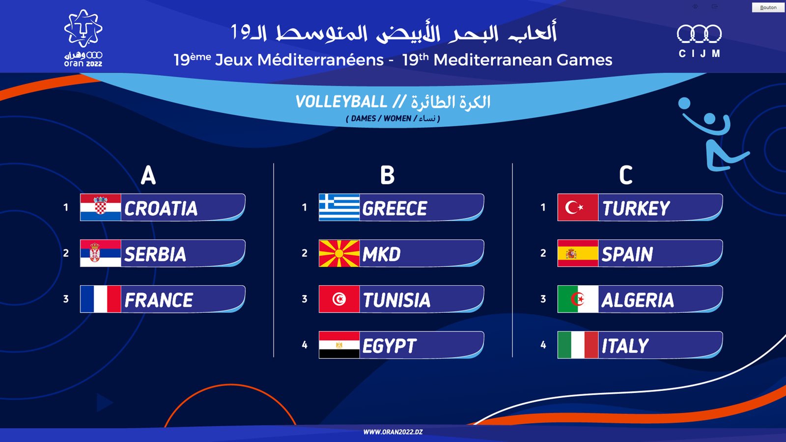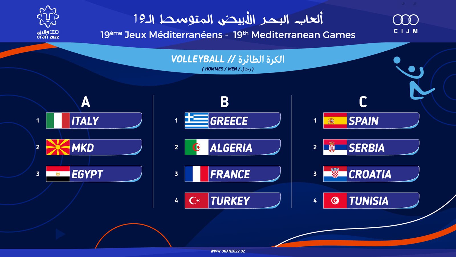 ويخوض فريق الطائرة رجال منافساته الدورة ضمن فرق المجموعة الأولى والتي ضمت كل من مقدونيا وإيطاليا بالإضافة إلى مصر، بينما يقع منتخب الطائرة سيدات ضمن المجموعة الثانية والتي ضمت منتخبات اليونان ومقدونيا الشمالية وتونس.. وجاءات المجموعات كالتي: