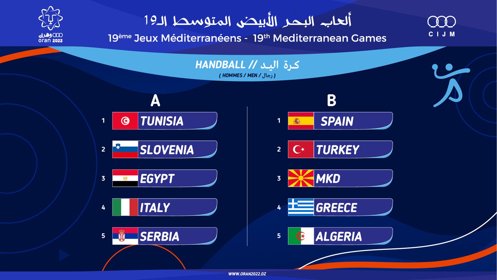 يشارك منتخب مصر لكرة اليد ضمن المجموعة الأولى والتي تضم منتخبت سلوفينا وإيطاليا وصربيا، ويتأهل أصحاب المراكز الأربعة الأولى من المجموعتين إلى الدور الثاني من منافسات دورة ألعاب البحر المتوسط.. وجاءات المجموعات كالتالي: