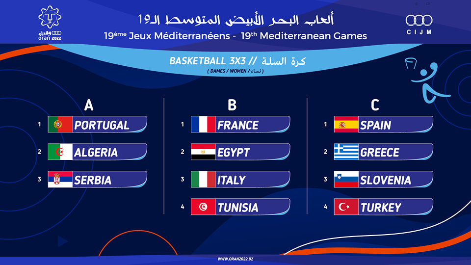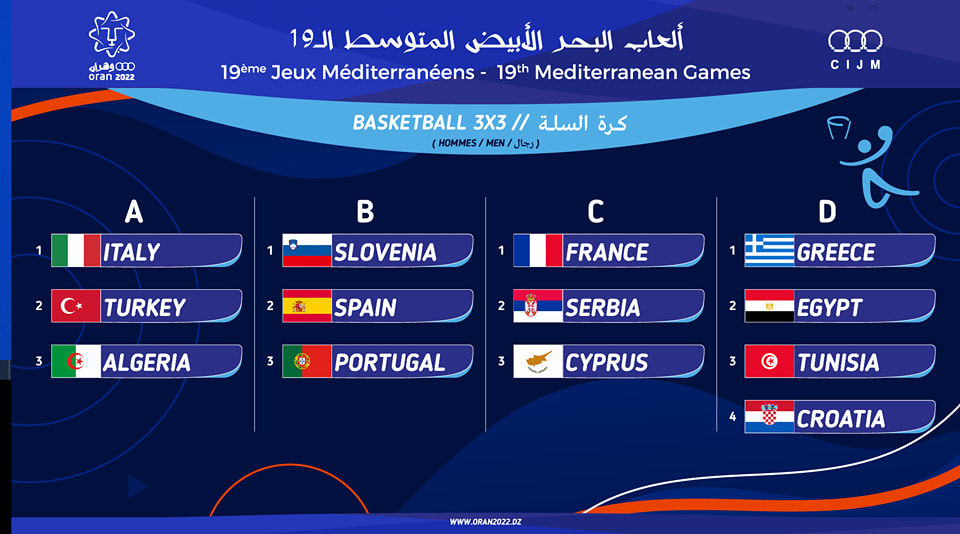 يشارك منتخب مصر لكرة السلة 3×3 رجال ضمن منافسات دورة ألعاب البحر المتوسط، في المجموعة الرابعة والتي تضم منتخبات اليونان ومصر وتونس وكرواتيا، فيما يشارك منتخب السيدات ضمن منتخبات المجمموعة الثانية التي ضمت فرنسا وإيطاليا وتونس وجاءت المجموعات كالتالي: