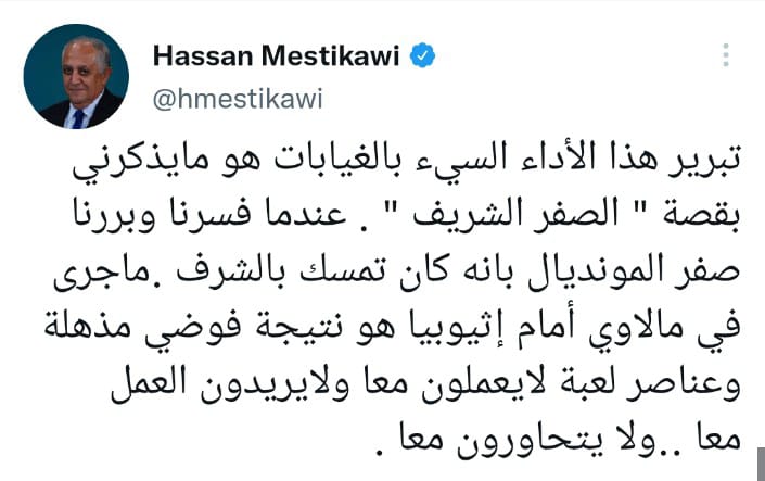 إذ غرد حسن المستكاوي الناقد الرياضي، قائلا: تبرير هذا الأداء السيء بالغيابات هو ما يذكرني بقصة “الصفر الشريف”، عندما فسرنا وبررنا صفر المونديال بأنه كان تمسك بالشرف، ما جرى في مالاوي أمام إثيوبيا هو نتيجة فوضي مذهلة وعناصر لعبة لا يعملون معا ولا يريدون العمل معا..ولا يتحاورون معا.