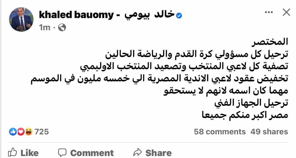 ونشر بيومي عبر حسابه الرسمي على موقع التواصل الاجتماعي فيسبوك، قائلا: المختصر ترحيل كل مسؤولي كرة القدم والرياضة الحالين، تصفية كل لاعبي المنتخب وتصعيد المنتخب الأولمبي، تخفيض عقود لاعبي الأندية المصرية الي خمسه مليون في الموسم مهما كان اسمه لانهم لا يستحقون، وترحيل الجهاز الفني، مصر أكبر منكم جميعا.