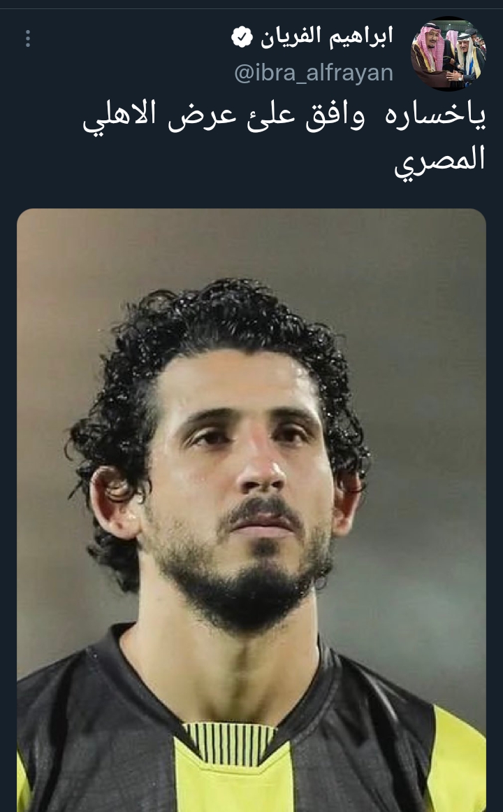 ونشر الإعلامي السعودي إبراهيم الفريان، عبر حسابه الرسمي على مواقع التواصل الاجتماعي، تويتر، صورة لـ أحمد حجازي، معلقًا: يا خسارة.. وافق على عرض الأهلي المصري.