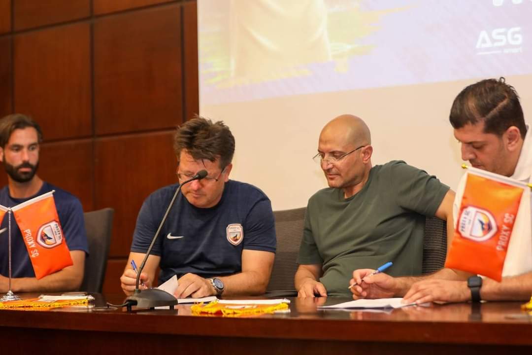 وشهد المؤتمر توقيع المدرب الهولندي ومساعده على عقد لمدة موسم بحضور فريد جليلة رئيس مجلس إدارة شركة بروكسي سبورت، والمهندس باسم بهاء الرئيس التنفيذي.