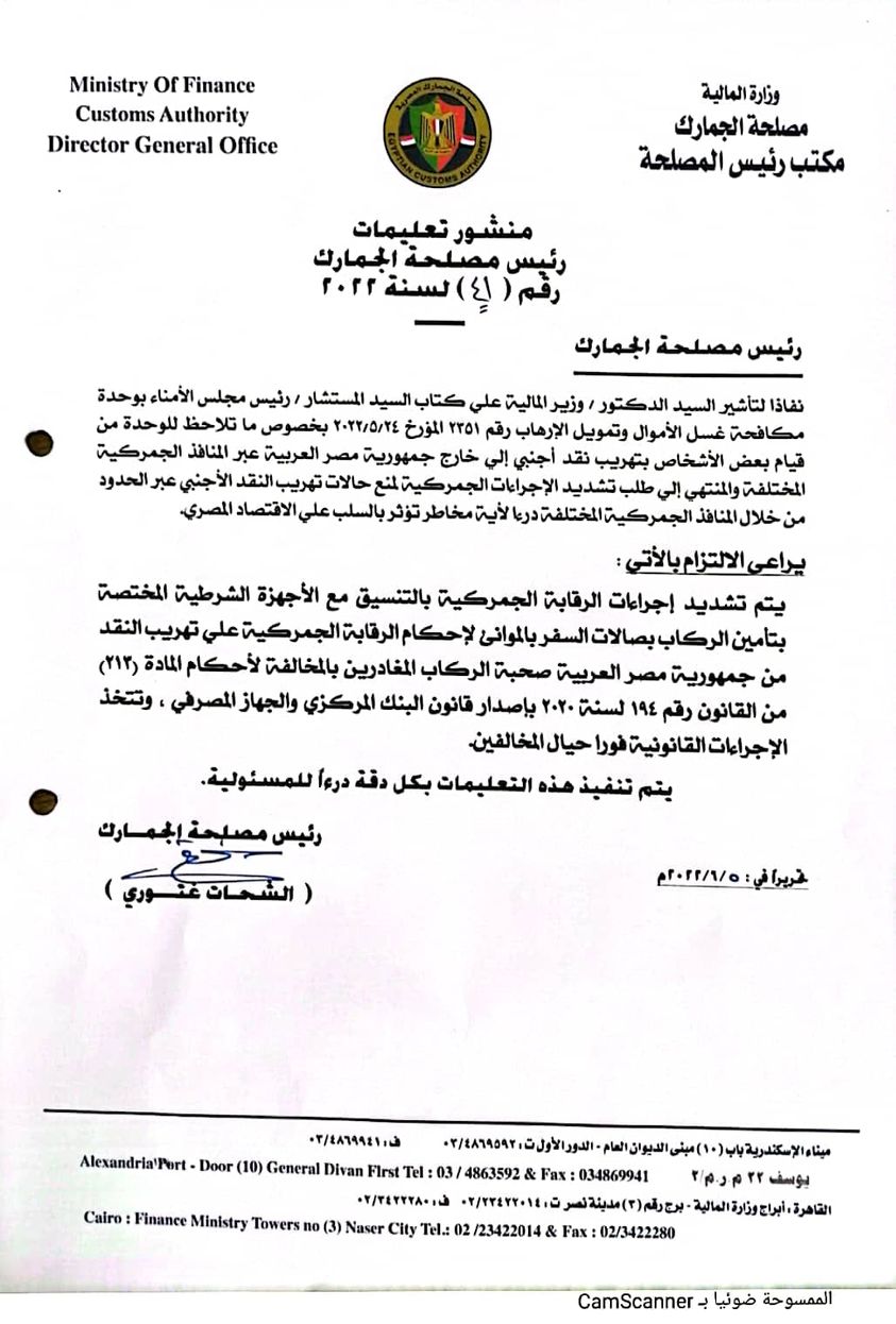 وأوضح المنشور رقم 41 لسنة 22 الذي حصل القاهرة 24 على نسخة منه، أنه نفاذًا لتأشير الدكتور محمد معيط، وزير المالية، على كتاب رئيس مجلس الأمناء بوحدة مكافحة غسيل الأموال وتمويل الإرهاب رقم 2351 المؤرخ بتاريخ 24 مايو 2022 بخصوص ما تلاحظ للوحدة من قيام بعض الأشخاص بتهريب النقد الأجنبي إلى خارج جمهورية مصر العربية عبر المنافذ الجمركية المختلفة والمنتهي إلى طلب تشديد الإجراءات الجمركية لمنع حالات تهريب النقد الأجنبي عبر الحدود من خلال المنافذ الجمركية المختلفة، درءً لأية مخاطر تؤثر بالسلب على الاقتصاد المصري.