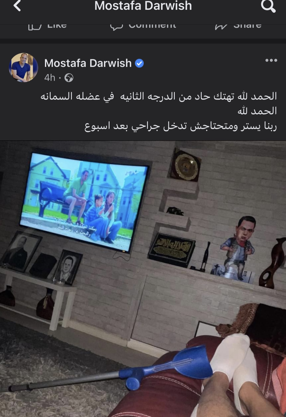 وكتب مصطفى درويش على حسابه الشخصي بـ فيسبوك: الحمد لله تهتك حاد من الدرجه الثانيه في عضلة السمانة.. الحمد لله.. ربنا يستر ومتحتاجش تدخل جراحي بعد أسبوع.