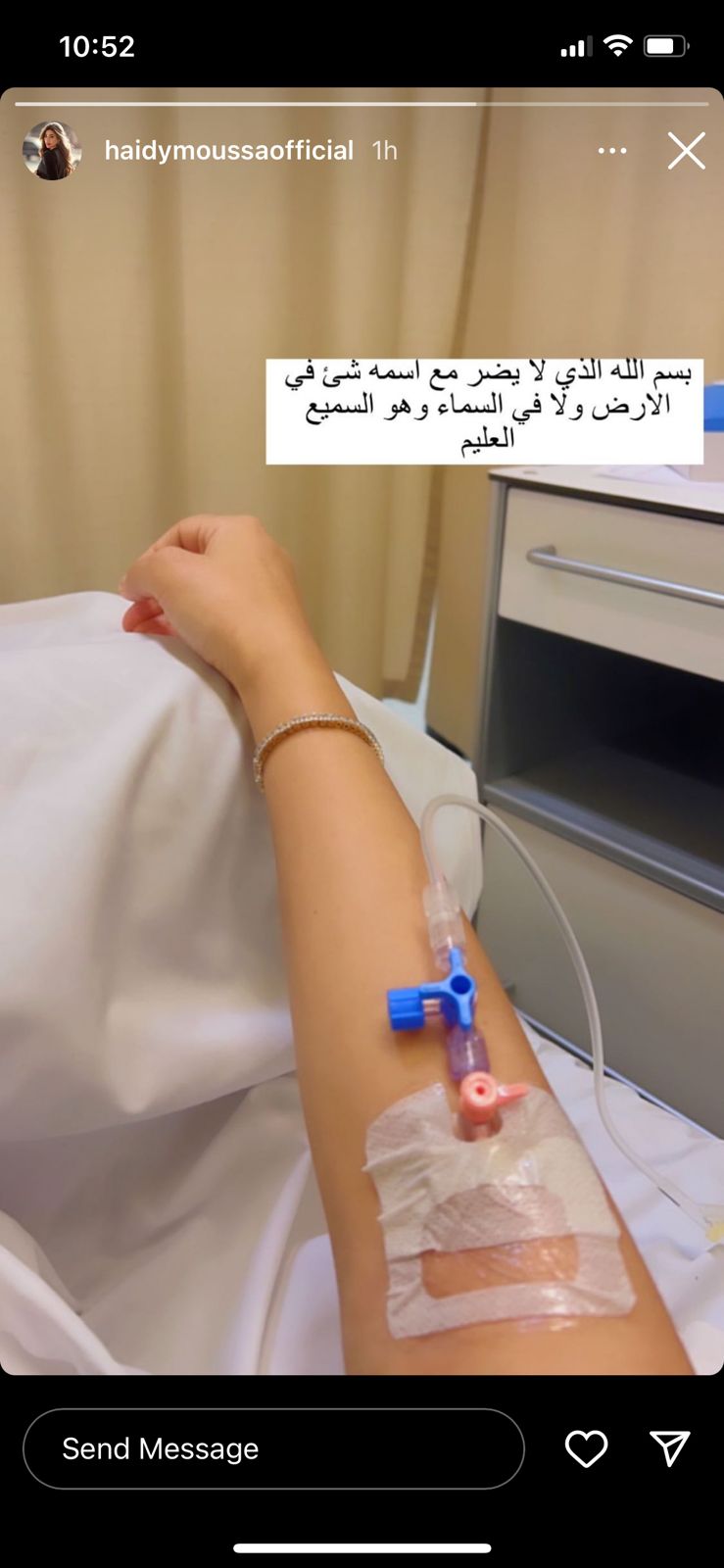 وشاركت هايدي موسى، متابعيها بصورة لها وهي داخل غرفة المستشفى، لتلقي العلاج المناسب ومتابهة حالتها الصحية، عبر حسابها الشخصي بموقع انستجرام، معلقة عليها: بسم الله الذي لا يضر مع اسمه شيء في الأرض ولا في السماء، وهو السميع العليم.