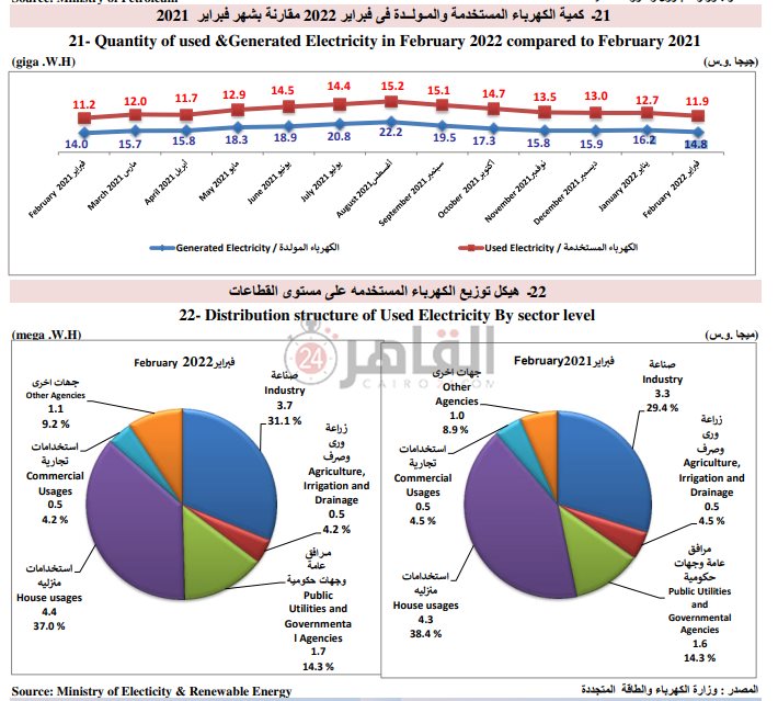 ارتفعت الكميات المستهلكة من الكهرباء خلال الشهور الأولى من العام الجاري 2022، واستحوذت الاستخدامات المنزلية على 37% من إجمالي الكهرباء المستخدمة خلال شهر فبراير 2022.