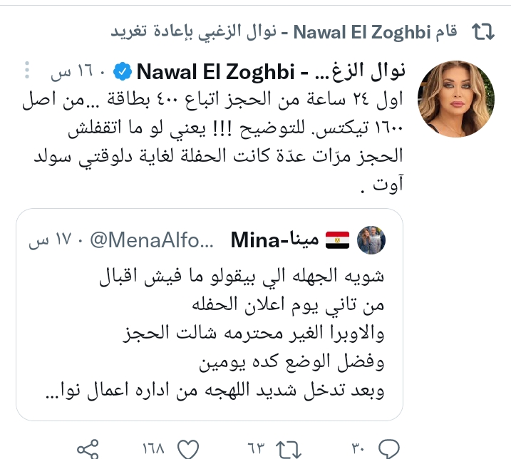 وتابعت نوال الزغبي: أول 24 ساعة من الحجز اتباع 400 بطاقة، من أصل 1600 تيكتس.. للتوضيح يعني لو ما اتقفلش الحجز مرّات عدّة كانت الحفلة لغاية دلوقتي سولد آوت.