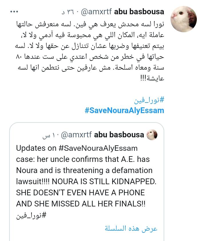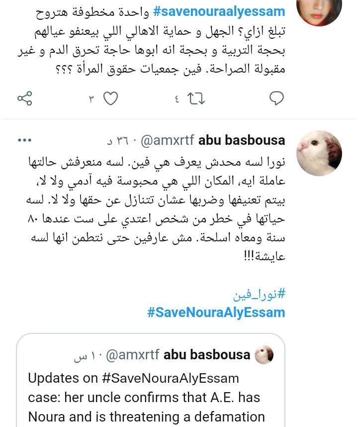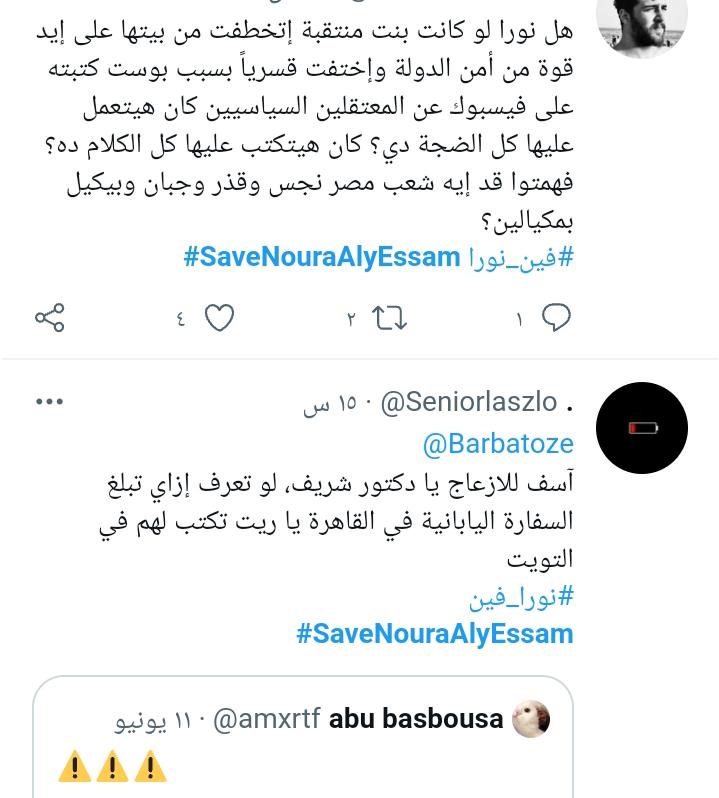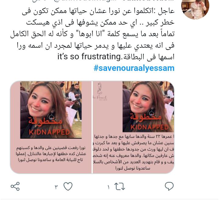 وشهد تويتر تغريدات عدة من خلال هاشتاج savenouraalyessam - نورا فين، وعلق أحد الرواد: عاجل، اتكلموا عن نورا عشان حياتها ممكن تكون في خطر كبير.. أي حد ممكن يشوفها في أذى هيسكت تمامًا بعد ما يسمع كلمة أنا أبوها.