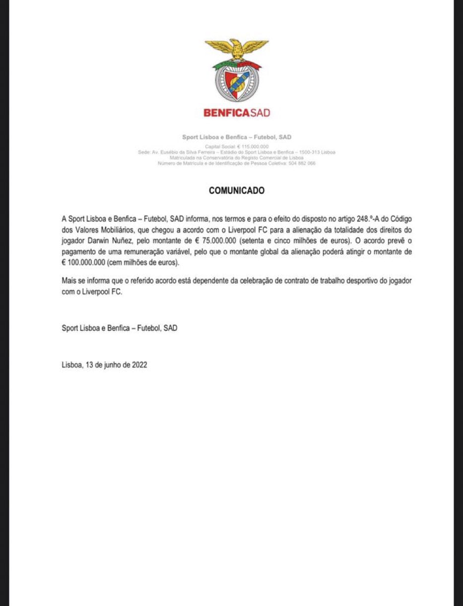 وتابع البيان: أن انتقال داروين نونيز إلى ليفربول قد تصل قيمته لمبلغ 100 مليون يورو بعد إضافة المتغيرات المتعلقة بالصفقة.
