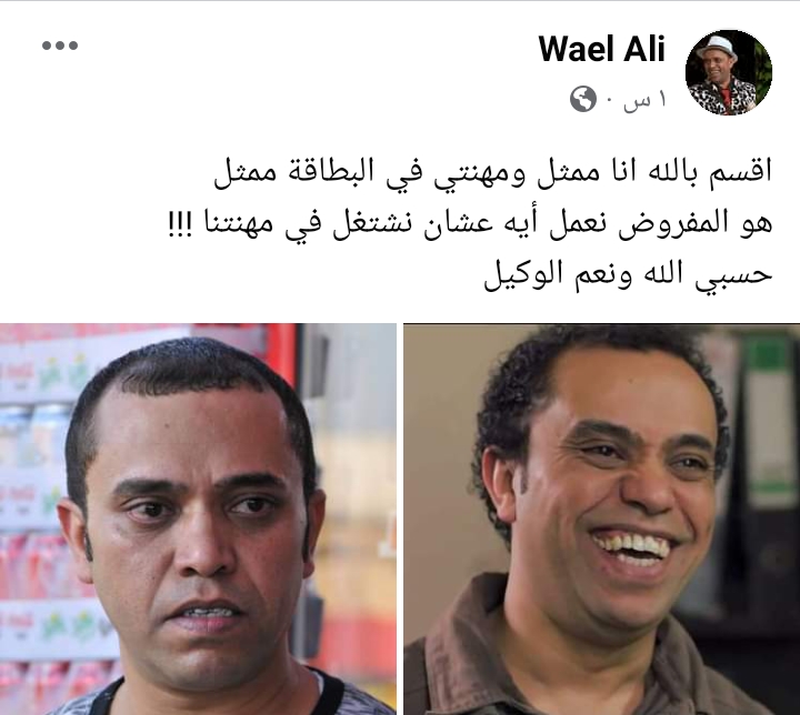 وكتب وائل علي، عبر حسابه الشخصي بموقع فيسبوك،: أقسم بالله أنا ممثل، ومهنتي في البطاقة ممثل، هو المفروض نعمل إيه علشان نشتغل في مهنتنا.. حسبي الله ونعم الوكيل.