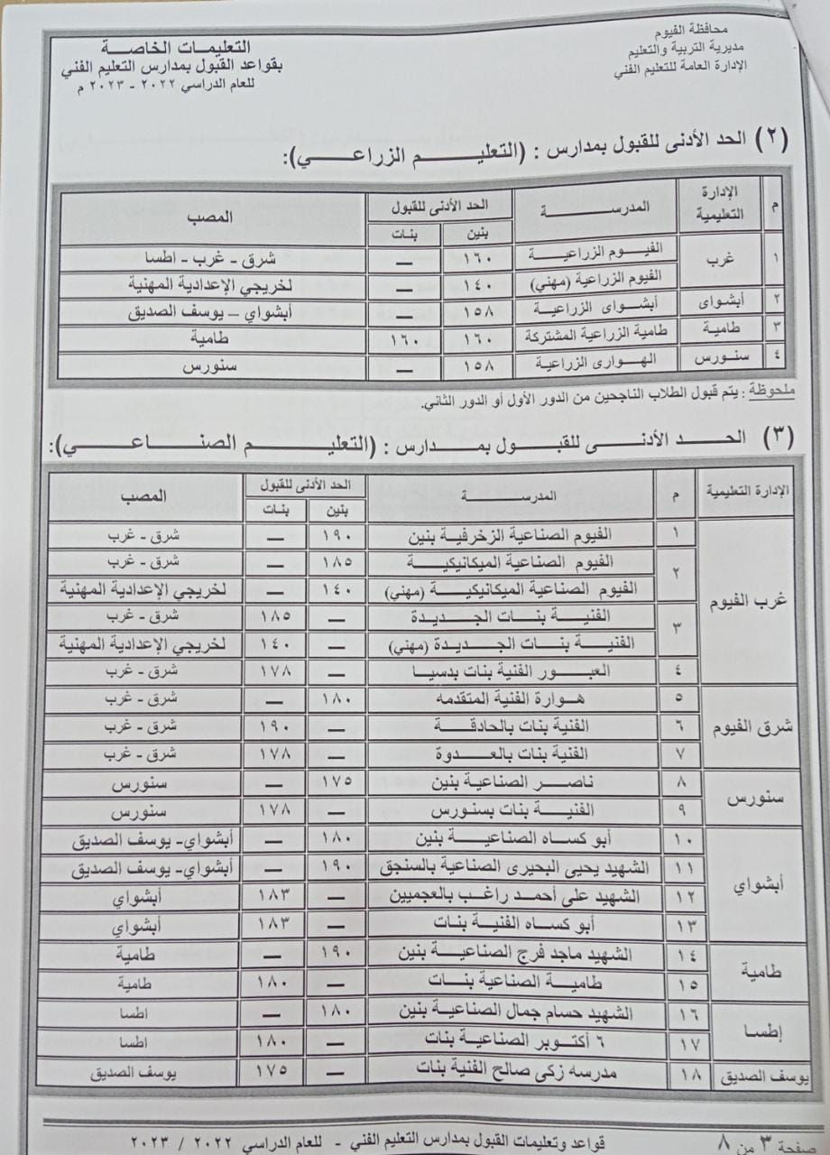 فيما تراوحت درجات القبول بالمدارس الفنية الزراعية، من 160 درجة إلى 140 درجة، بواقع 160 درجة لمدرستي الفيوم الزراعية، وطامية الزراعية المشتركة، و158 درجة للقبول بمدرستي أبشواي الزراعية، والهواري الزراعية بسنورس، و140 درجة لمدرسة الفيوم الزراعية، مهني بنين، لخريجي الإعدادية المهنية.