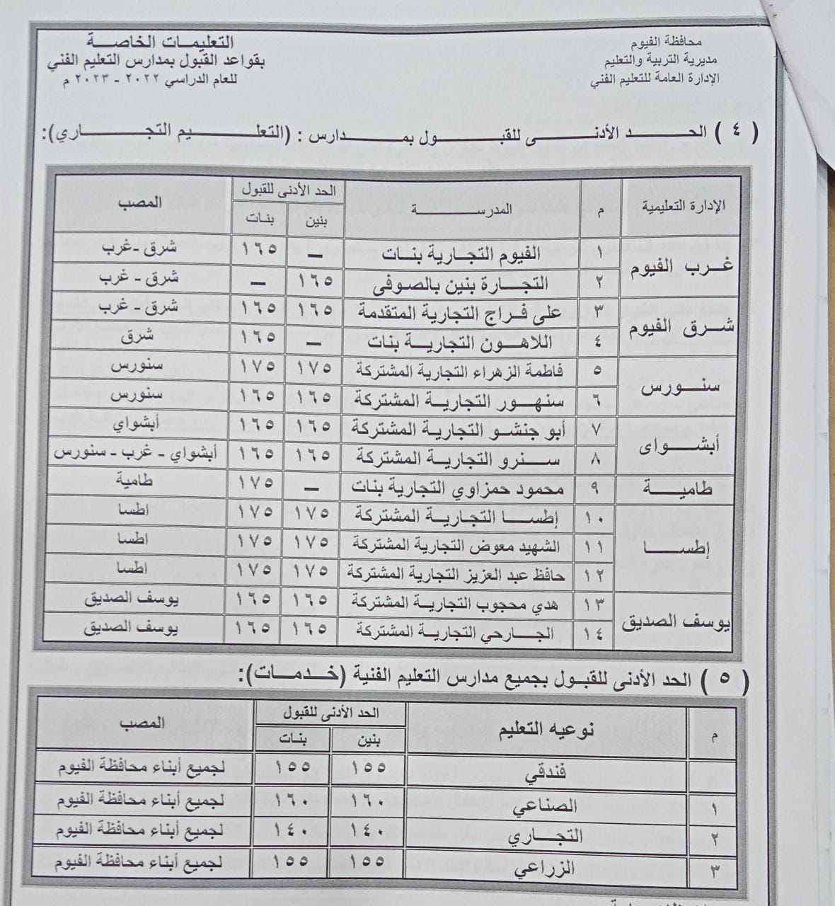 كما تراوحت درجات القبول بمدارس التعليم الفني الصناعي، من 190 درجة إلى 175 درجة، عدا مدرستي الفيوم الصناعية الميكانيكية، مهني بنين، والفنية بنات الجديدة، مهني بنات، لخريجي الإعدادية المهنية، وجاء الحد الأدنى للقبول بهما بمجموع 140 درجة، فيما جاء الحد الأدنى للتنسيق بمدارس التعليم التجاري بمجموع درجات يتراوح من 165 درجة إلى 175 درجة، وبالنسبة للقبول بمدارس التعليم الفنية، خدمات، الفندقي والزراعي بمجموع 155 درجة، والصناعي 160 درجة، والتجاري 140 درجة.