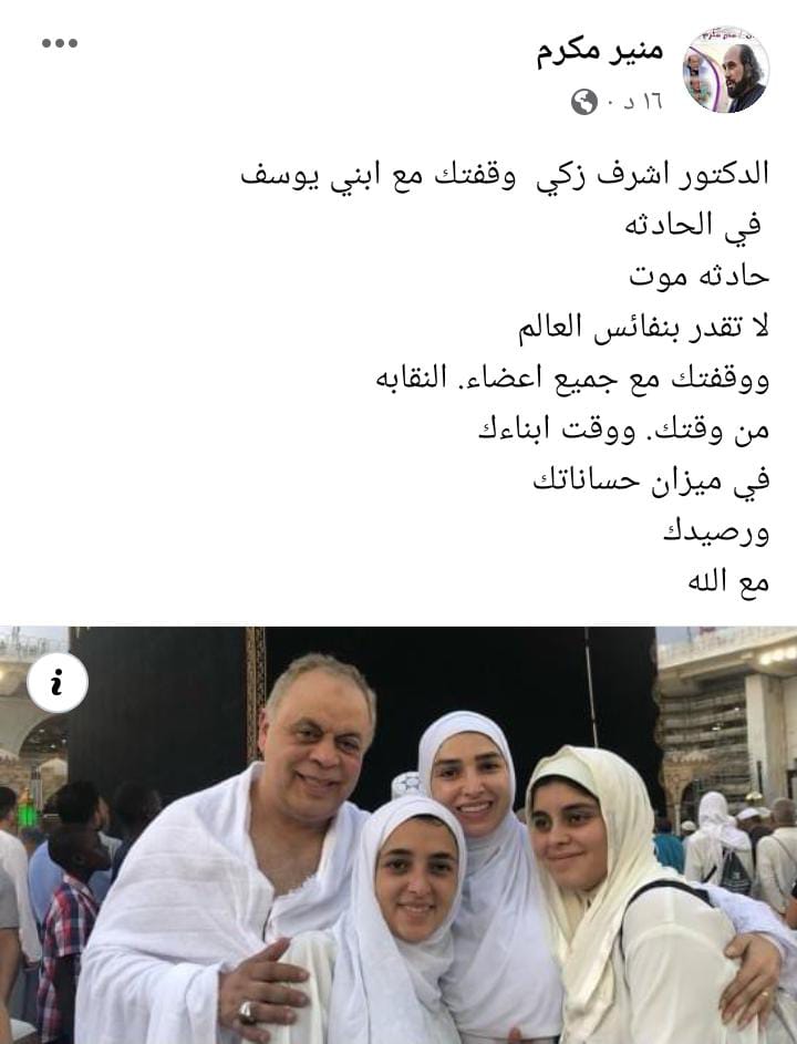 ونشر منير مكرم، صورة، لـ أشرف زكي، وهو يؤدي مناسك العمرة، وعلق عليها قائلًا: وقفتك مع ابني يوسف في حادثه موت، لا تقدر بنفائس العالم.. ووقفتك مع جميع أعضاء النقابة بيكون من وقتك، ووقت أبنائك في ميزان حسناتك ورصيدك مع الله.
