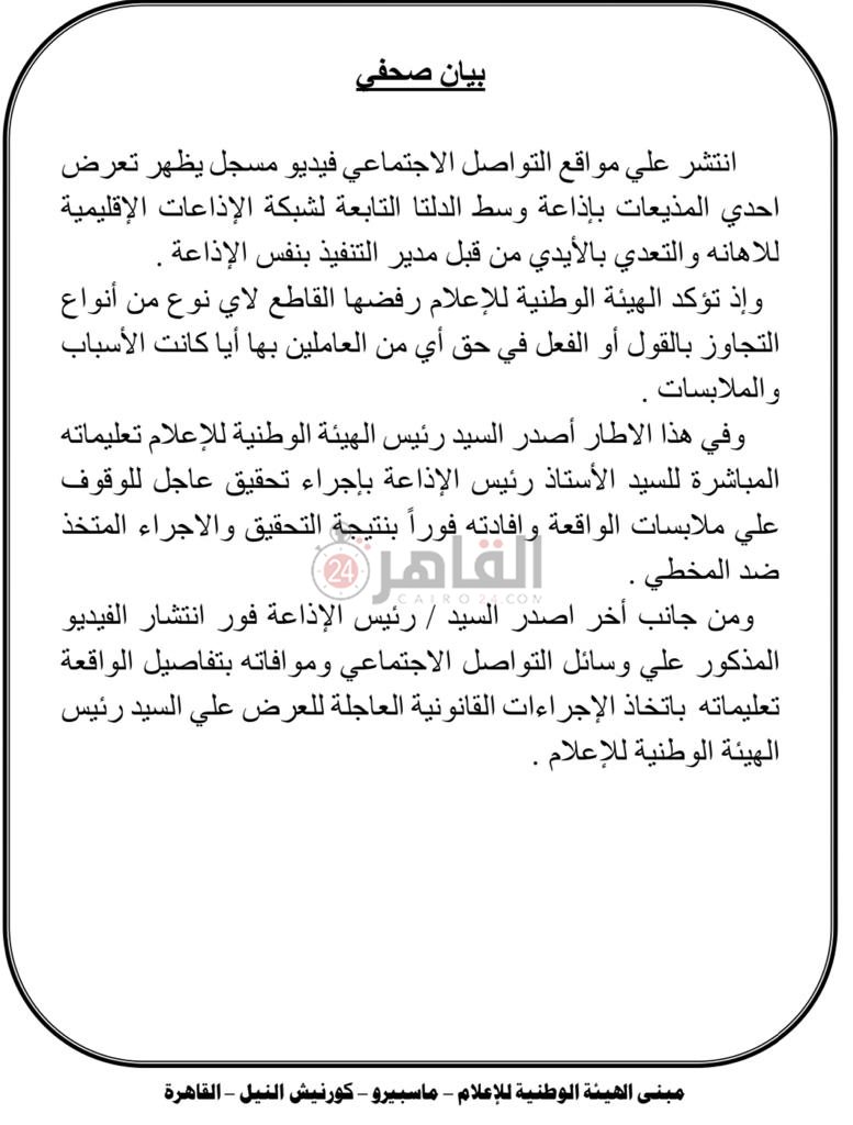 وقال محمد نوار، رئيس الإذاعة، في تصريح لـ القاهرة 24، إنه فور انتشار الفيديو المذكور على وسائل التواصل الاجتماعي وموافاته بتفاصيل الواقعة تم اتخاذ الإجراءات القانونية العاجلة ضد الشخص المذكور، موضحًا أن الهيئة الوطنية للإعلام، أعلنت رفضها القاطع لأى نوع من أنواع التجاوز بالقول أو الفعل في حق أي من العاملين بها أيا كانت الأسباب والملابسات.