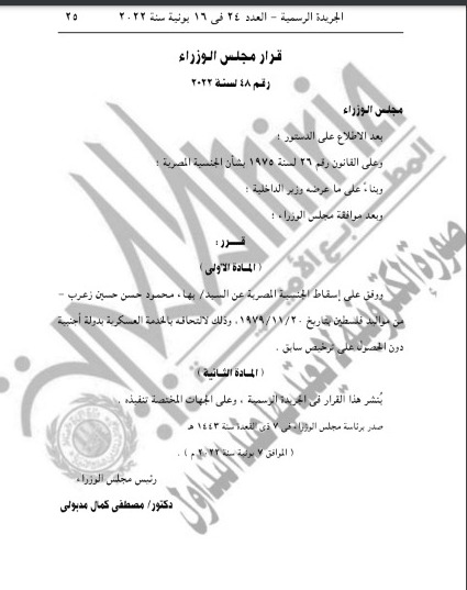 الحكومة تصدر قرارًا بإسقاط الجنسية المصرية عن مصري لالتحاقه بالخدمة العسكرية بدولة أجنبية
