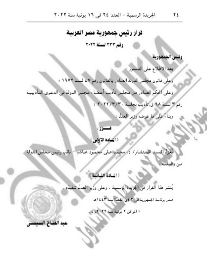 كما نشرت الجريدة الرسمية ، في عددها الصادر اليوم الخميس، قرارًا جمهوريا جديدًا لـ الرئيس عبدالفتاح السيسي رقم 233 لسنة 2022 بعزل المستشار الدكتور محمد علي محمود هاشم، نائب رئيس مجلس الدولة من وظيفته.