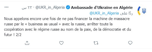 ووجهت السفارة الأوكرانية دعوة إلى الشركات الجزائرية، بأنها تساهم في تمويل آلة الحرب الروسية قائلا: ندعو مرة أخرى إلى عدم تمويل آلة المجازر الروسية بـ العمل كالمعتاد مع روسيا، ووقف كل تعاون مع النظام الروسي باسم السلام والديمقراطية والمستقبل.