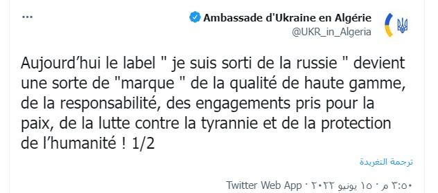 وقالت السفارة الأوكرانية في الجزائر في تغريدة لها على موقع التواصل الاجتماعي تويتر: اليوم أصبحت تسمية خرجت من روسيا نوعًا من علامة الجودة العالية والمسؤولية، والالتزام بالسلام ومكافحة الاستبداد وحماية الإنسانية.